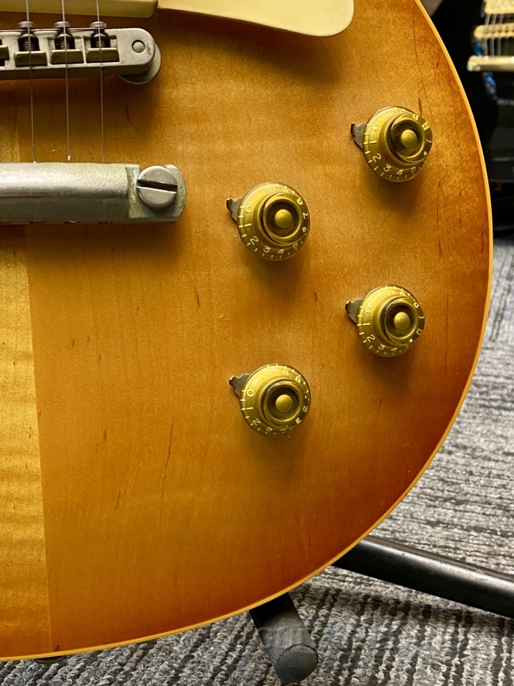 ペグ、ブリッジ、テールピースなどの金属パーツはくすみ・サビ加工が施されたパーツに交換、プラスティック・パーツも合わせて交換し、見事なエイジドギターに仕上がっています。