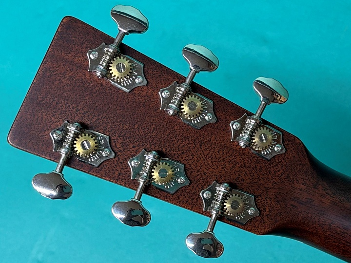 ボディートップはエイジングトナーで着色されたスプルース、サイドバックはマホガニー、セレクトハードウッドネック、指板とブリッジはエボニーです。べっ甲柄ピックガード、ブラック・セルバインディング、ヘッドトップにOLD-STYLEロゴ、オープンバックペグ、戦前000-18風の雰囲気タップリのルックスです。