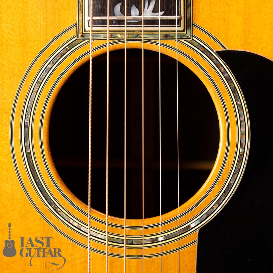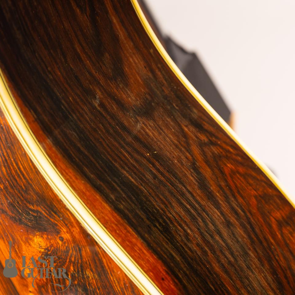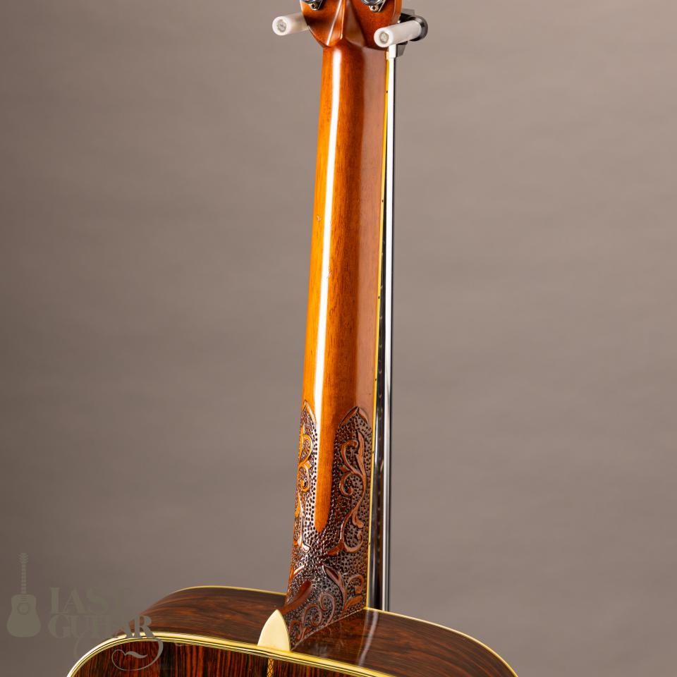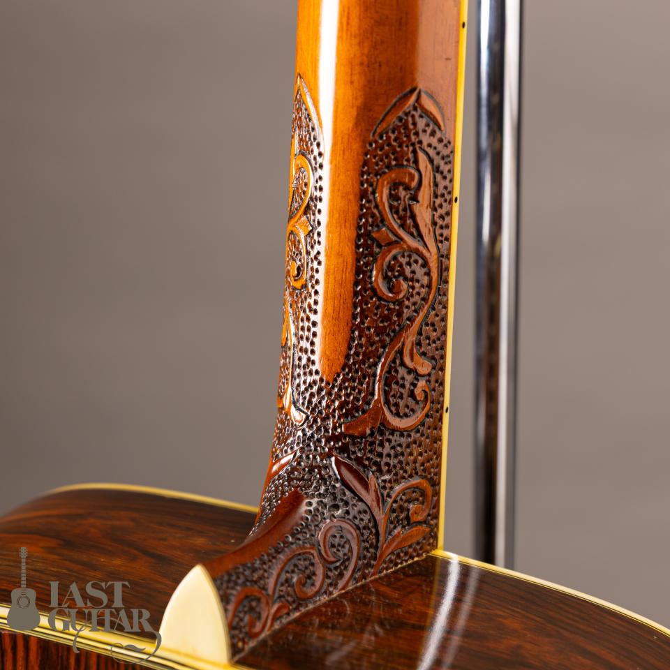 サイド&バックには、豪華な木目のハカランダが使用されており、やはりインパクトがありますね。そして、縦ロゴに丸ヘッド、ツリーオブライフのフィンガーボードインレイ、アバロンパーフリング&ロゼッタ、ネックヒールに彫刻が施されるなど、高級機らしい贅沢な仕様となっております。ペグも、グローバーが搭載されています。