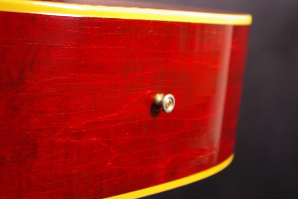 1960年代後期で珍しいレギュラーネックのDOVEがチェリーサンバーストフィニッシュで入荷しました!!トップはスプルース、サイドバックにはメイプル材、この時期としては珍しい1ピースマホガニーのレギュラーネックを採用、60年代を代表するギブソン上位機種で硬質でキレのよいサウンドが持ち味!スペックから1968年製が有力でグローバー製のペグ、ビス止めされたピックガード、ハカランダブリッジの主なパーツはオリジナルで残っていました。トップの1弦側指板近くにクラック補修箇所があります。所々に打痕傷、全体的にウェザーチェック、バックに塗装負けがありますが60年近く経過しているわりには綺麗で調整も行き届いていますので演奏性、サウンドが優れています!ネックヒールへはストラップピンが打っています。ピックアップの取り付け加工はございません。ヘッド角度は14度、ナット幅約42mmのネックグリップになります。ネックは以前にリセット調整していますのでアングルも適正でトラスロッドの動作も問題なく機能しています。フレット、ナットも牛骨材で交換済みで長期で安心いただけます。弦高もハイポジションまで押さえやすい低めの高さで調整しています。サドル側での微調整も可能です。ナローネックと比べるとレンジが広くよりパワフル!ザクザクと歯切れが良くストローク中心で演奏される方に一押しですね!是非この機会にお試しください!汎用ハードケース付き