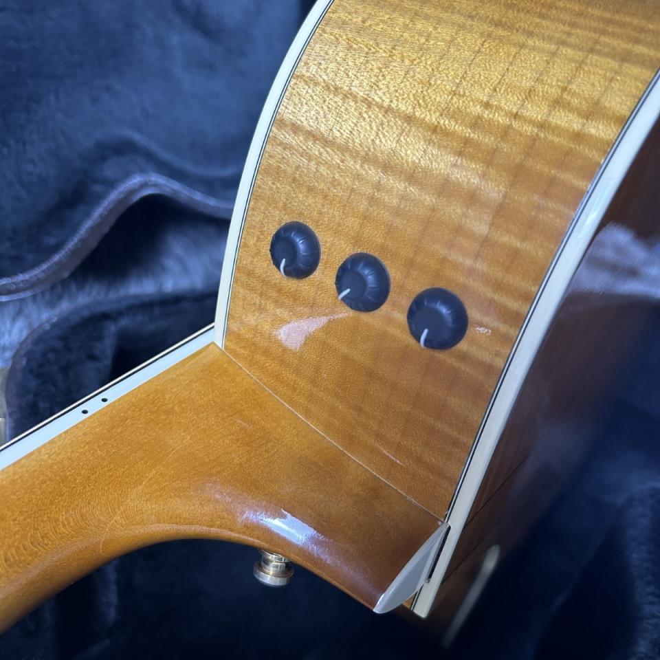 ウッドマテリアルはスプルーストップ、3Pフィギュアドメイプルバック&フィギュアドメイプルサイド、メイプルネック、エボニー指板を採用した贅沢な仕様。