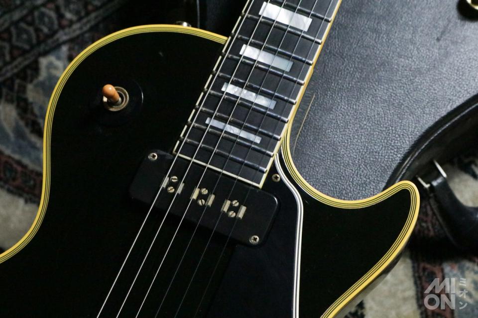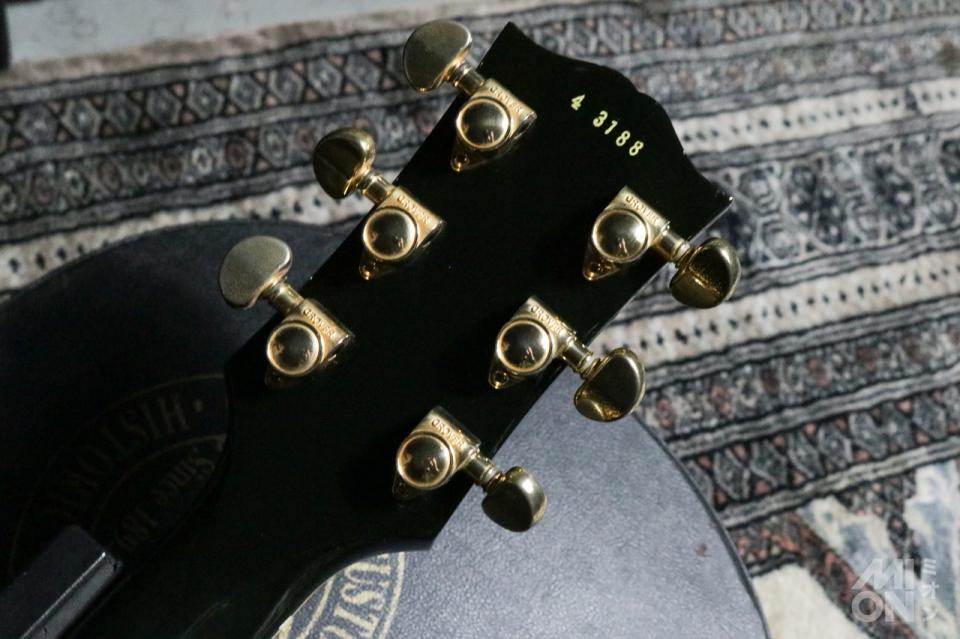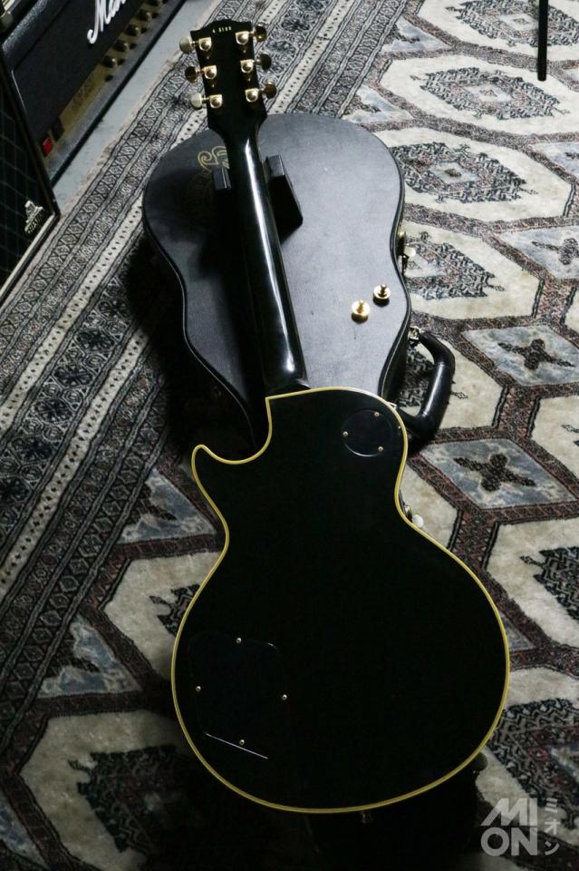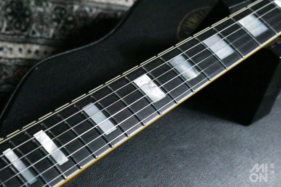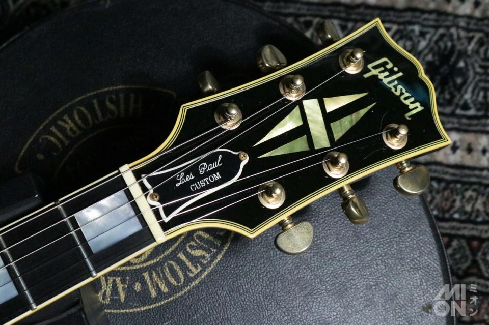 「レスポール・カスタム」は、1954年に上位機種のレスポールとして登場し、一度1960年に生産を終了。54年の登場時はオールマホガニーですが、68年の再登場からはスタンダードと同様にメイプルトップ、マホガニーバックというボディ構造に変更されています。指板はエボニーです。