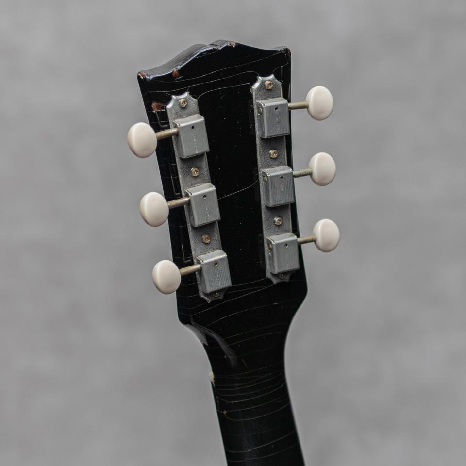 ワーキングホース"J-45"。ギブソンを代表するラウンドショルダーボディのジャンボモデル。数ある歴代の仕様の中でも人気の高い1967~1969年製、その中でもこの時期のカラーモデルは保守的とも言えるフラットトップでは見かけることも少なくヴィンテージ市場ではとりわけ人気が高いモデルのひとつ。本器は、ブラックビューティーの1968年製の1本。ロゴなしネジ止めホワイトガード、ダウンベリーブリッジ、"2"刻印のブラックカラーモデルと、ファンの心をくすぐるスペック。スプルーストップ、マホガニーサイド&バック、マホガニーネック、ローズウッド指板&ダウンベリーブリッジ、ダブルリングロゼッタ、ロゴなしネジ止めホワイトカラーポインッテドラージガード、ナット幅実寸約40.5mmネック、14度ヘッド角、ノンスキャロップド・Xブレイシング、ブラックフィニッシュ。サドルはセラミックアジャスタブルサドルに、ペグは近年シングルラインクルーソンペグに交換されています。もともとJ-45の標準カラーはサンバーストで、カラーバリエーションモデルとしてナチュラルフィニッシュのJ-50が用意されています。その他のカラーは一部のオーダーメイドを除いて基本的には存在しないはずですが、この時期にのみスペシャルカラーとしてエボニーブラックとチェリーレッドが発売され、またJ-45の中ではこのタイプに限り、ホワイトカラーのピックガードをネジでマウントしたユニークな仕様となっています。美しい漆黒のブラックカラー。奥深く響きパーカッシブなテイストがたまらないアジャスタブルJ45サウンド。ダークで濁りのある箱鳴りと、パーカッシブでアタックのクリアな響き。よく弾き込まれレスポンスの心地よいグッドサウンドの1本。掻き鳴らせばロックに、時にはノスタルジックに。音楽的で雰囲気満点のサウンドを魅せ付けてくれます。経年によるウェザーチェックが雰囲気を助長し、打痕でさえかっこよく見えるのはまさにギブソンマジック。トップのブリッジ1弦からエンドにかけてのヘアラインクラックの補修、またバックセンター付近に縦方向に渡るクラックの補修が見られるためお値打ち放出の本器。クラック補修はいずれもクリートが打たれ丁寧に補修されており、ご使用への懸念はみられません。ネックまわりはとても良好で、弾きやすいアクションをしっかりと保ってくれています。過去にピックアップ取付履歴があり、エンド部が12mmに加工されています。現状はコンバージョンピンが装着されています。ここ数年、出回りの機会も少ないオリジナルカスタムカラー”J-45”。アイコニックな人気スペックのブラックカラーの1本。ガシガシ弾いてお使いいただきたいプレイビンテージの1本です。お見逃しなく要チェックください。ハードケース付属