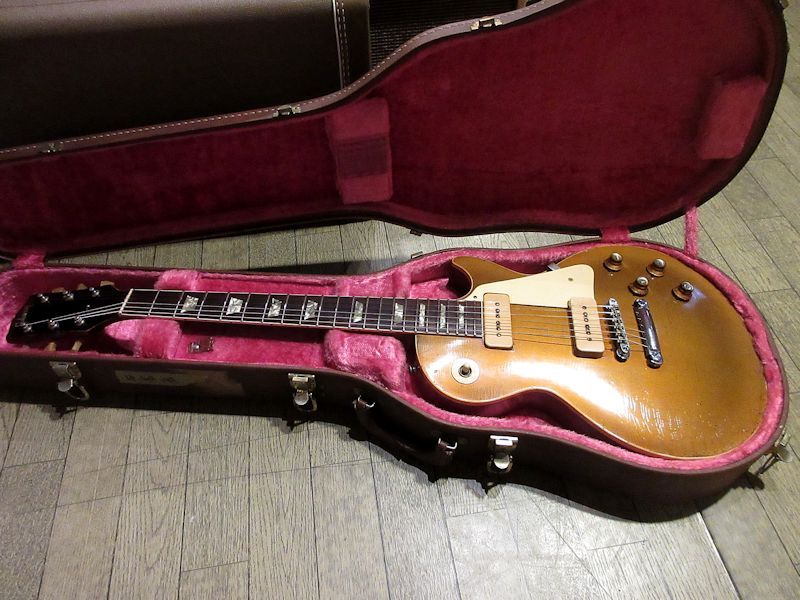 1968年に再登場したオリジナルシェイプのレスポールモデル。P-90搭載のスタンダードとハムバッカー搭載のカスタムが再発されましたが、翌年69年途中には1ピースネックが3ピースとなり、ボディーバックも1ピースからパンケーキボディーに移行するため、50年代同様の木取りで製作された再発初期の個体は市場において高い人気を誇ります。本機は1969年製初頭の生産と思われ、僅かに大きくなったヘッド形状とiドットが無い以外は68年製と同様のスペックを持った希少個体!ネックジョイントもディープジョイント方式で組み上げられております。細かなウェザーチェックにビッシリ覆われ、グリーニングが生じている様は50年代Gold Topと見まがう貫禄のルックス。フレット・ナット、ジャックプレートなどいくつかのパーツチェンジはあるものの、澄んだクリーントーンとレンジ感と粘りのあるドライブサウンドは流石の一言です♪価値ある仕様のレアスペックGold Top、所有欲をたっぷりと満たしてくれる格好の良さと、確かなVintageサウンドが味わえる逸品!オススメです♪ウェイト4.49kg、社外製ハードケース付属。