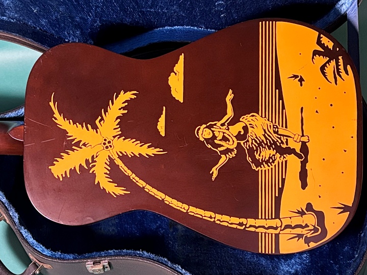 1988年製のHULA BLUESです。ウッドボディー、ボディーバックにハワイアン・フラガール、トップにヤシの木がデザインされたハワイアンな雰囲気タップリのルックスです。