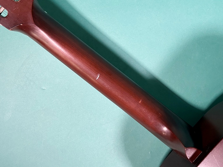 ナット幅:46㎜(実測)90年代のモデルより太めのしっかりしたネックグリップです。アジャストロッドは効いていますが、締めしろは固着しています。30年以上経っていますので、大きくネックが動く心配はないと思います。弦高は12フレット上で6弦:2.7㎜、1弦:2.5㎜程でセットしています。スライド弾きと指で押さえる両方で扱いやすいセッティングです。