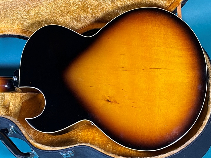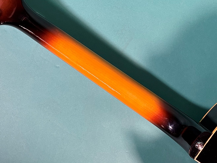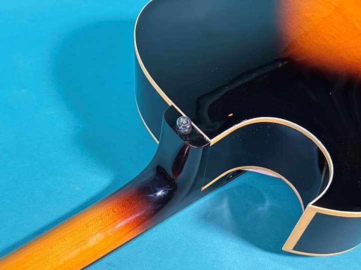 通常使用の演奏等でついた表面的なスリキズ、ポツキズ、アテキズが散在していますが、大きく目立つキズや板のワレ等のダメージはありません。ネックヒールにストラップピンが打ってあります。