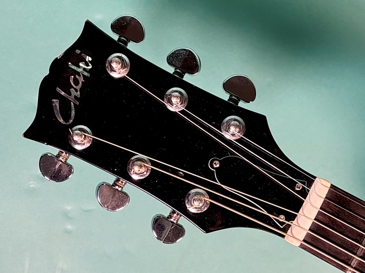 チャキギターは戦後間もない1947年、茶木純啓氏により京都で創業されたとあります。歴史のあるブランドでコントラバスを中心に弦楽器の製造・販売・修理を行っていました。1960年代中期にアーチトップギターの制作をはじめています。1970年代のチャキギターはのちに独立された製作家の辻四郎氏が製作を任されていました。楽器の細部の仕上げは、同年代の国産ギターと比較するとラフな手作り感が残っていて、それがこの楽器の魅力だと思います。