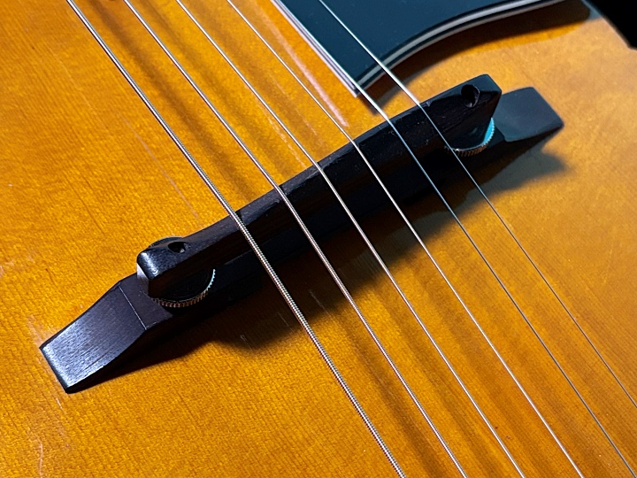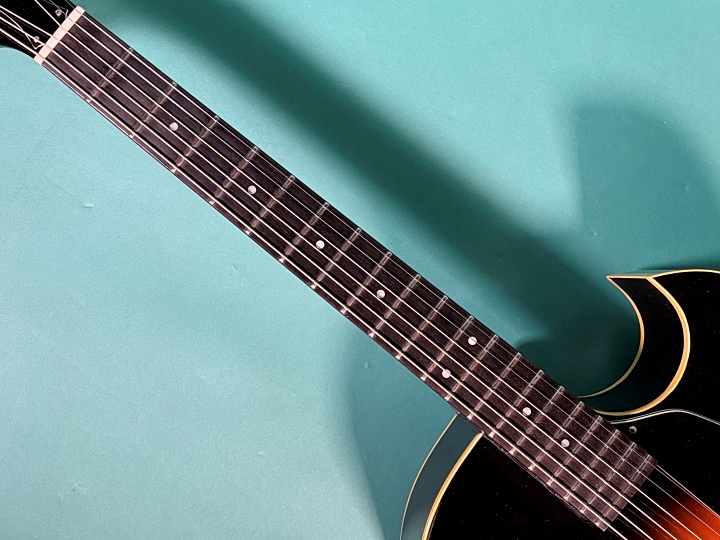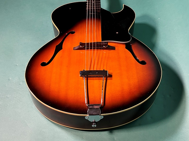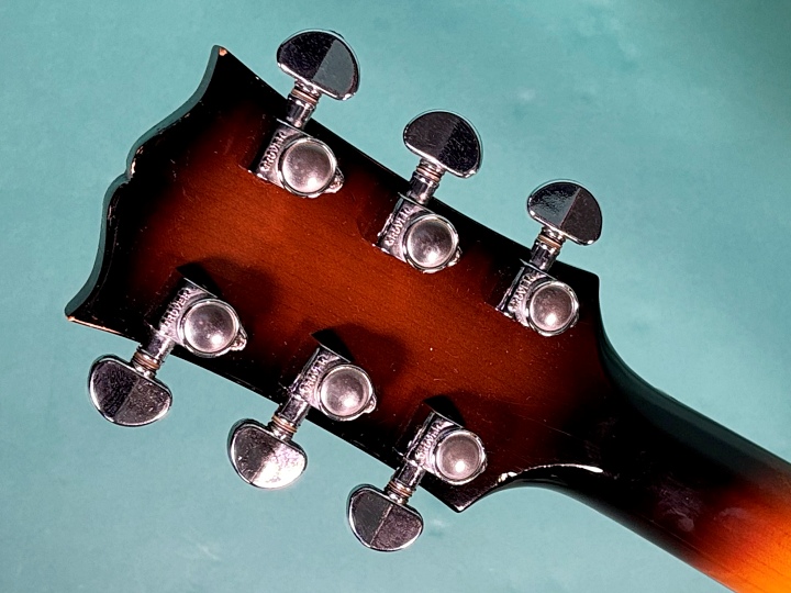 ボディートップはスプルース、サイド&バックはメイプル、メイプルネック、ローズウッド指板、ローズウッドのアジャスタブルブリッジです。ペグはグローバー102C、メッキも綺麗で動作はスムーズです。テールピースのメッキ表面は経年によってポツサビが出ていますが、実用には問題ありません。