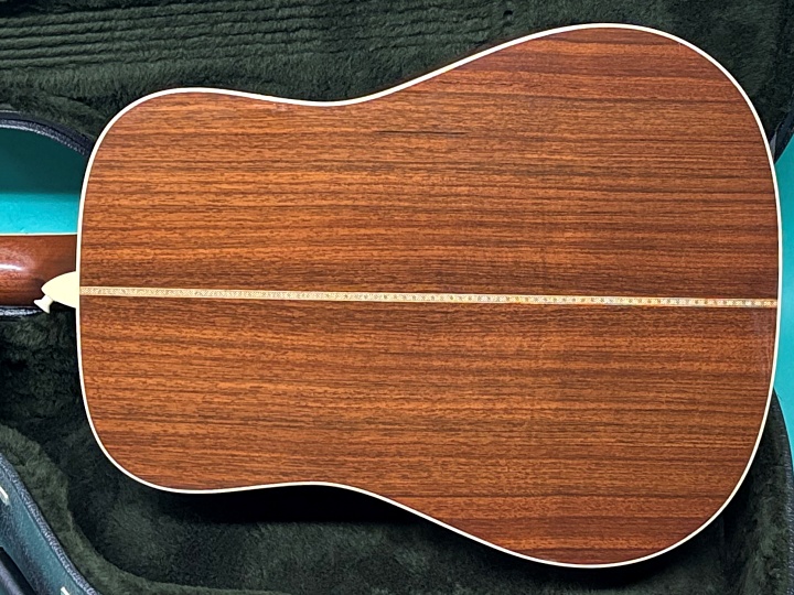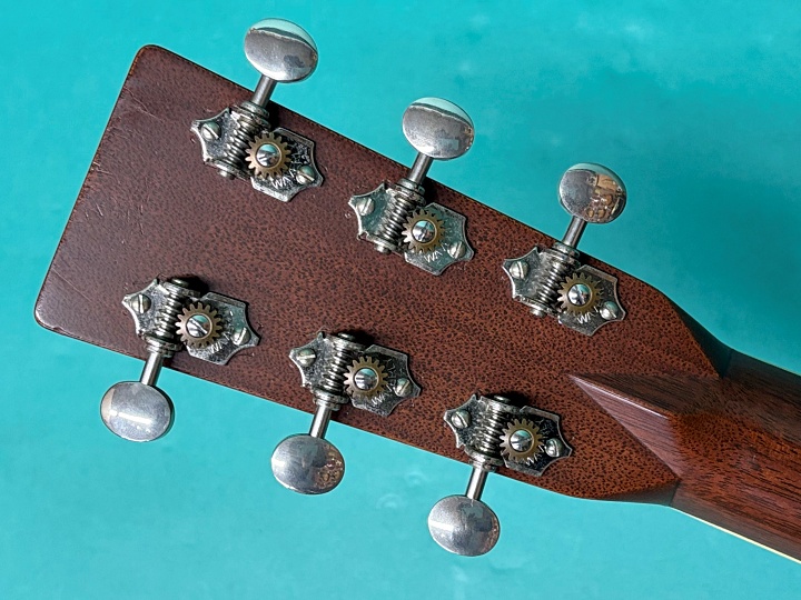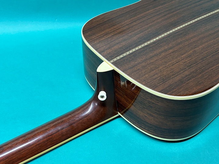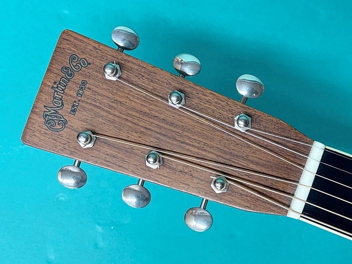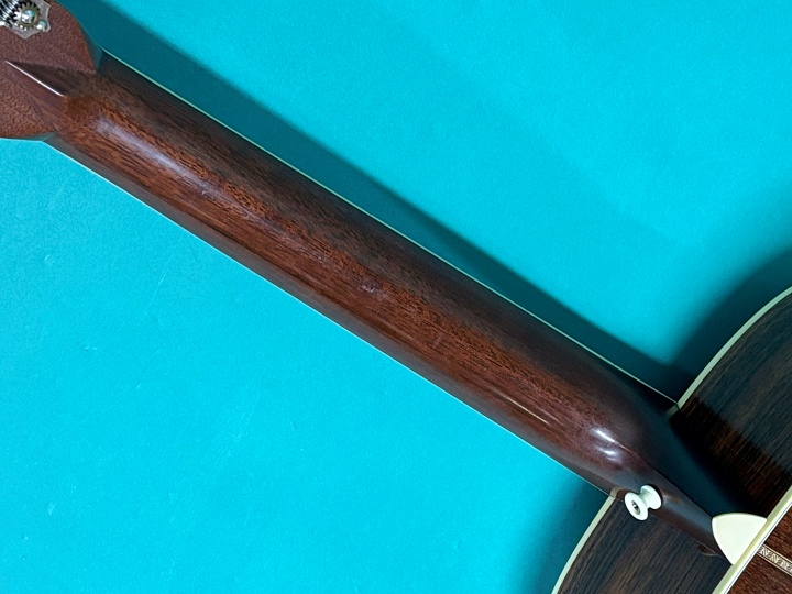 ボディはヘリングボーン・パーフリングにアイボロイドのセルバインディング、ブレイシングはフォワードシフト・スキャロップドブレイシング仕様。ナット幅は44.5mm、フレット数は21、ロングサドルスロット仕様、ネックグリップはモディファイドVシェイプ、ヘッドロゴは “OLD MARTIN STYLE” 仕様です。