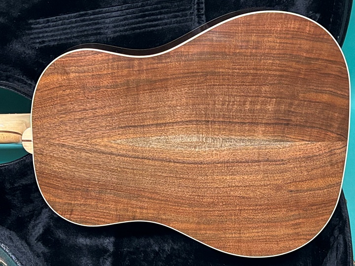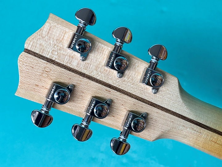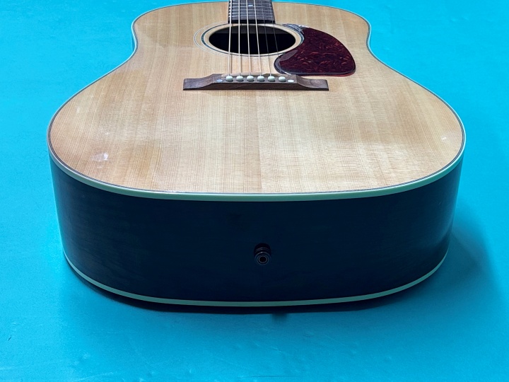 ボディはJ-45と同じラウンドショルダースタイル。ボディトップはスプルース、サイド&バックはウォルナット、メイプルネック、ウォルナット指板・ブリッジという仕様です。ナット幅は43.8mm、628mmスケール、ネックはスリムテーパー。ナットとサドルはタスク製、ペグはミニ・グローバーのロトマチックで、動作もスムーズです。ピックガードは、厚みのある丸いエッジのベベル加工が施されたスモールガードを採用。トラスロッドカバーには「2016」の刻印が入っています。