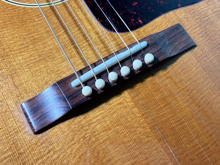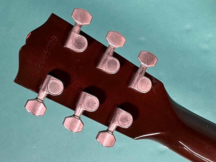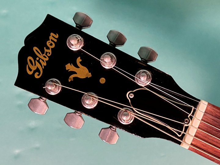 ボディトップはスプルース、サイド&バックはマホガニー、ローズウッド指板、ローズウッドのストレートブリッジを採用し、オリジナルに近いルックスです。ナチュラルカラーフィニッシュで、経年変化により色焼けした渋く良い雰囲気となっています。オリジナルのロトマチックペグもメッキのくすみは見られますが、動作はスムーズです。ナット幅は43.8mm、25.5インチ(648mm)スケールです。