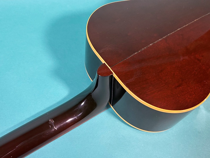 新品時から約30年が経過しているため使用感があり、経年変化によるラッカー塗装のウェザーチェックが見られます。ボディトップのセンター横2か所に木部割れの補修歴があり、大きな箇所には裏側からパッチ当てによる補強修理が施されています。その隣にある約10cmのクラックには接着修理が施されています。現在は安定しており、演奏上の影響はありません。サウンドホール上部センターにもクラックがありますが、こちらも接着修理済みです。