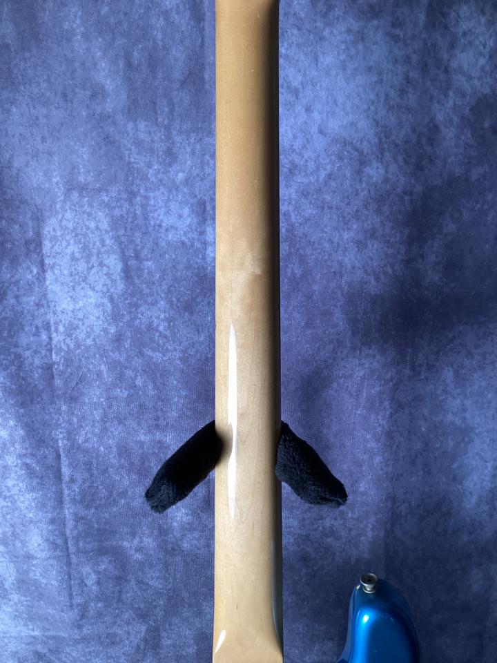 細かいラメの入ったブルーのフィニッシュとミントグリーンのピックガードの対比が美い1本です。