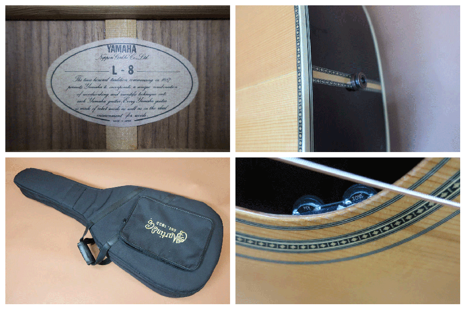 希少な'70年代の初期モデル、YAMAHA L-8の入荷です!本器はシリアルのスタンプから1970年製になります。ヘッドには初期仕様のオリジナルTM-50Gゴールドペグ、トップはえぞ松単板、サイド&バックにはパリサンドル単板が採用され、エボニー指板&ブリッジ、スモール・べっ甲柄ピックガード、5フレットからのオリジナル・ポジションマークに寄木細工のパーフリングでシンプルなルックスですが後期のL-10に匹敵するハイスペック・モデルです。サウンドはスケール感の有る伸びやかな低域とレスポンスの良い中域は初期ならではの粒立ちの良い出音で、年代ならではの乾いたブライトで『シャリ~ン』と響く高音域の煌びやかな鳴りが魅力です。状態は製作から40年以上経過しておりますが使用感も年代にしては少なめで、ペグの金属劣化は見られますが輝きも残っており機能的にも問題はありません。よく見ないと分かりませんがトラスロッドカバーが交換されております。トップは光に翳して見る角度でわかるぐらいの軽微なスクラッチ傷ぐらいで目立つダメージは見受けられません。サイドは入荷時にウエストのくびれ箇所のバインディング浮きが有り修理済みで、右サイドの上部辺りに打痕と軽い擦り傷が見られます。バックも中央と下辺りに打痕が見られますが年代を考えればまずまずの備金コンディションではないかと思います。ネック裏も綺麗で気になるダメージも無くフレットも8分目程度は残っております。また本ギターはL.R.Baggs アクティブピックアップが搭載されエンドピンジャックに交換されており即戦力でライブやレコーディングでご使用が可能です。弦約651mm、ナット幅約43mm、弦高も12F6弦」で約2.5mm、1弦約2.2。サドルの余裕も約2.5mm有り、ネックを含めプレイヤビリティも良好です。Martin Gigケースが付属しています。ピックアップ搭載のお買得品です。