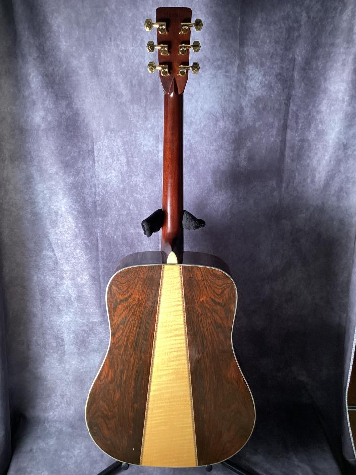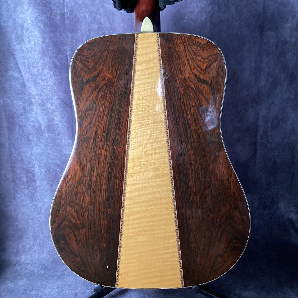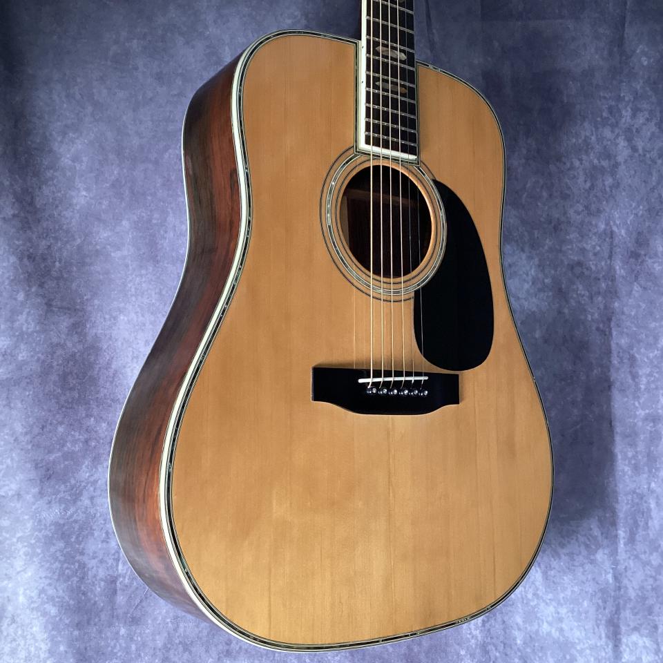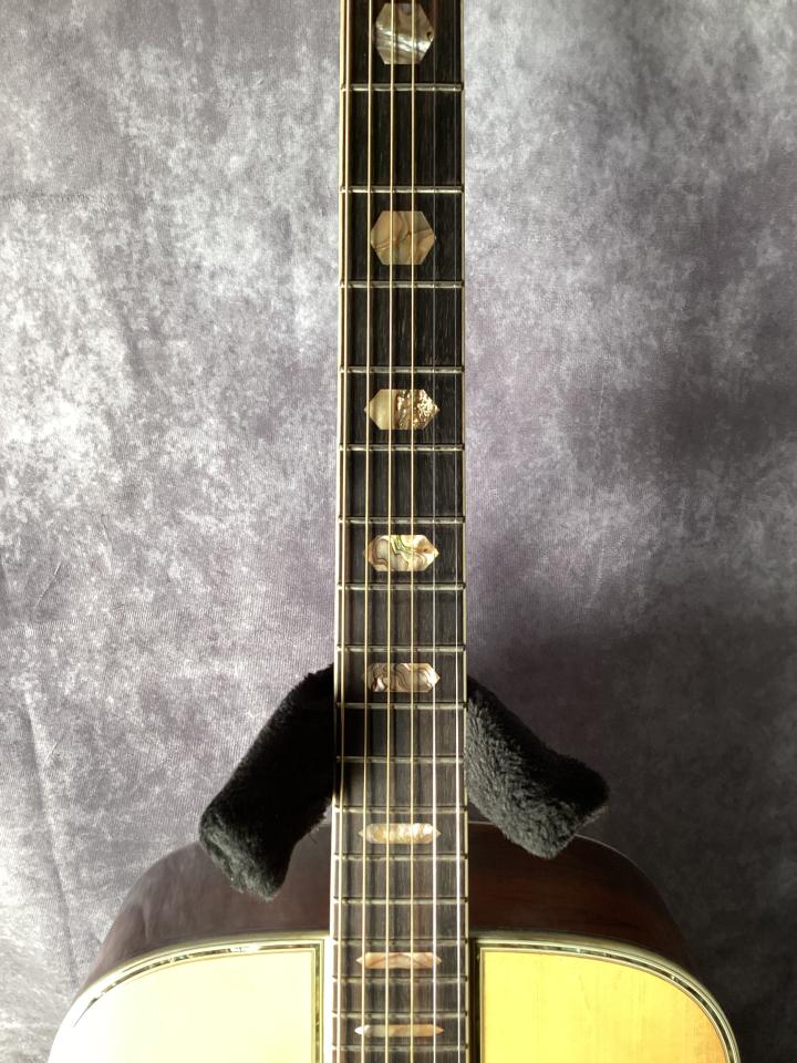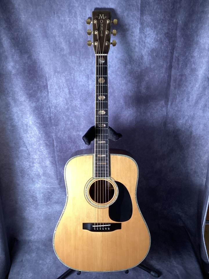 D-45スタイルを踏襲した縦ロゴ仕様に、豪華なインレイワークをあしらい、ハカランダ材を贅沢に使用した上位モデル。Morris W-100ならではの気品と存在感を兼ね備えた一本です。