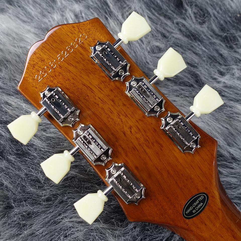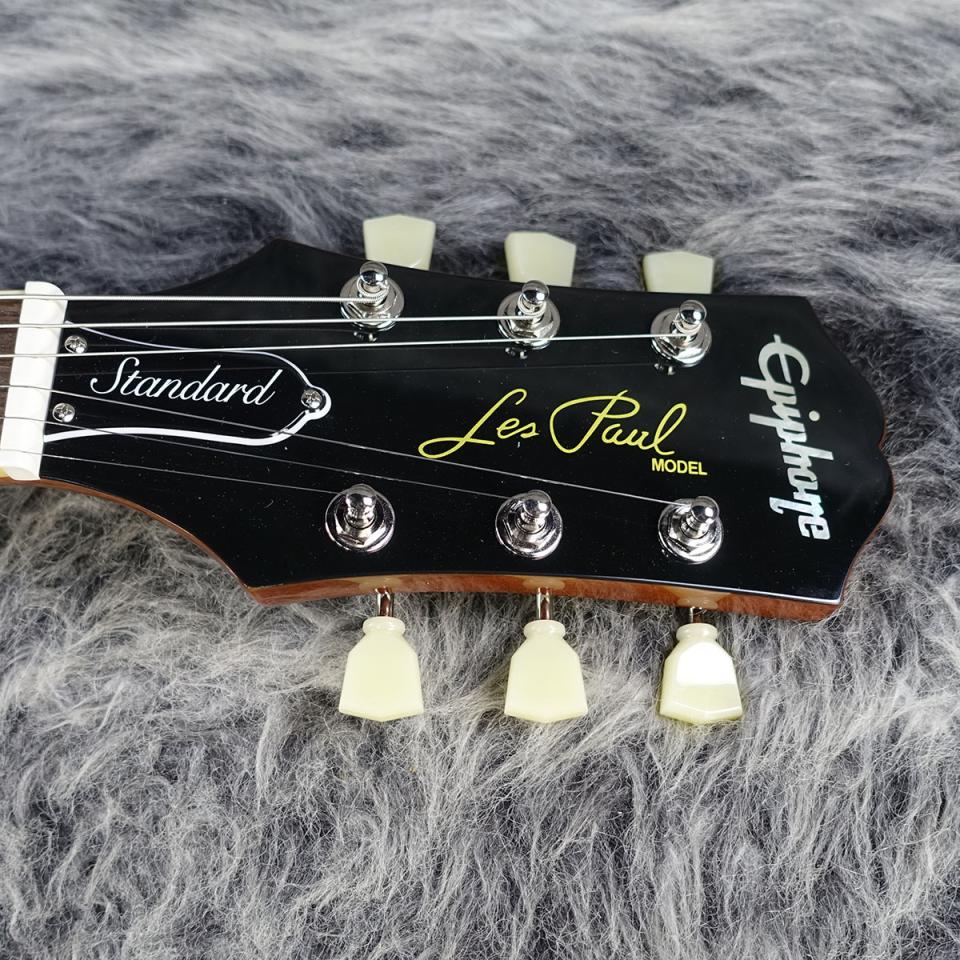 エピフォンレスポールスタンダード50sは、グロス仕上げのボディにメイプルトップ(フィギュアドトップのモデルにはAAAグレードのフレイムメイプル化粧板)の材構成をもち、ロングネックテノン仕様でジョイントされた50sシェイプネック、クラシカルなディッシュインレイが施されたインディアンローレル指板、新開発のヴィンテージデラックスチューナー、定評のあるエピフォンProBuckerハムバッカー、ダイヤルポインタ付きのゴールドトップハットノブなど、充実の仕様群を誇ります。