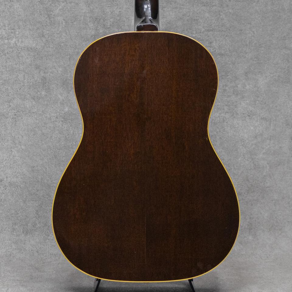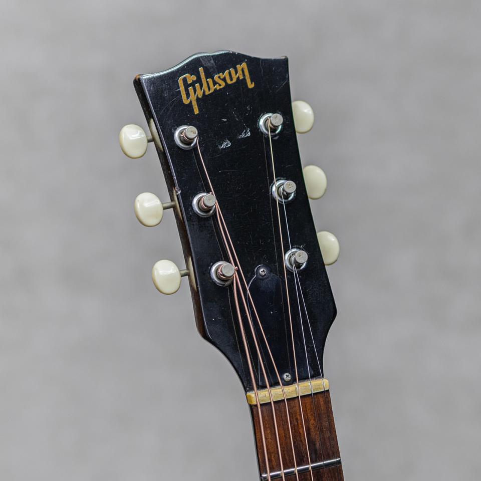 ブックマークする 値下げ通知に登録ギブソンスモールボディの中でも固定的な人気を誇る"B-25"。1942年に発売されたスモールボディモデルの"LG-2"と"LG-3"が1962年に"B-25"へと入れ替わる形でモデル継承され、その後1977年の製造中止まで長年に渡りギブソンスモールボディの定番モデルとしてロングランの製造をされました。現在でも"LG-2"や"B-25"と言えば取り回しの良い小ぶりなギブソンモデルとして高い人気を誇ります。本器はナチュラルカラーの"B-25"、1967年製Vintage品。スプルーストップ、マホガニーサイド&バック、マホガニーネック、ローズウッド指板、ローズウッドブリッジ&アジャスタブルサドル、ダブルライン3連クルーソンデラックスペグ、シングルリングロゼッタ、ポインテッドチックガード、ノンスキャロップド・Xブレイシング、ナット幅約39.7mmネック、14度ヘッド角。アジャスタブルサドルに加えヘッド角が浅くナロウネックになるこの年代特有のパーカッシブで快活に小気味の良い響き。しかし小振りなサイズながらしっかりとエアー感を持った低音と音量感もあり、かき鳴らせばドライで歯切れよく、フィンガータッチでは野太くノスタルジックに、ビンテージギブソンならではの雰囲気を存分に楽しませてくれます。使用に伴う小傷・打痕、全体的に雰囲気抜群のウェザーチェックがあるものの、表面の光沢を残し経年の貫禄を魅せてくれる本器。外観の雰囲気を損なうものはなく、ネック周りも良好で弾きやすいアクションをアジャスタブルサドルの調整幅をしっかりと残し保っています。スモールボディながらサウンドのバランスが良く、多彩に活躍してくれるコレクションにもプレイにもオススメな1本。是非お見逃しなく。Gibson製チップボードケース付属