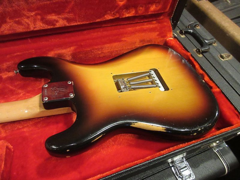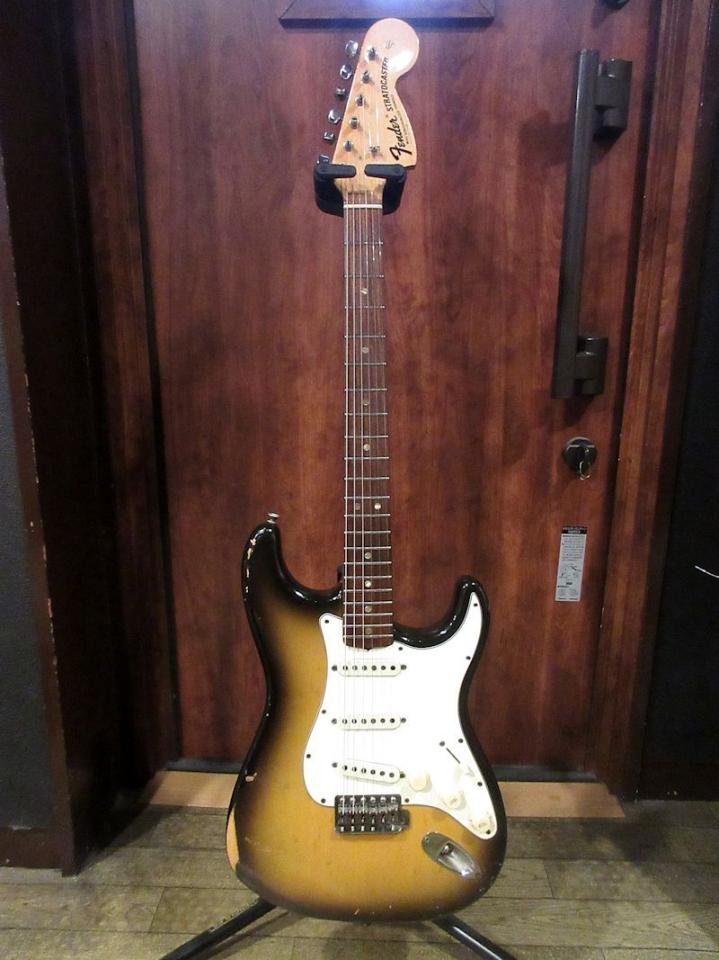 1954年の誕生以来、様々なスペックチェンジを経ながら生産が続けられてきたStratocaster。現在もエレクトリックギターの王道モデルとして君臨するモデルですが、1960年代中期以降は生産数が落ち込み、廃番寸前となる危機を迎えます。そんな折に訪れたロック全盛の時代、様々なギタリストが手にしていたことで再び人気機種として返り咲きます。本機はまさにその時期に生産された1970年製の個体、アルダーボディー、ローズウッド指板のメイプルネック、ラージヘッドに輝くウィズシンロゴ!別のチューナーが取り付けられていた時期があるようですが、現在はFキーチューナーに戻されており、ストリングスガイド追加跡も綺麗に埋めなおされております。握り心地の良いこの時期のネックグリップに加え、リフレットも施されておりますので、プレイアビリティーは快適そのもの!ややターン数が抑えられたこの時期のグレイボビンピックアップらしい、クランチさせると芯の周りにモチモチの絡みつくやうな倍音をまとい、ファズフェイスなど歪み系との相性も抜群!サンバーストがフェイドしたルックスも超クール!是非是非お試しいただきたいナイスなストラトです!ウェイト3.51kg、ブラックトーレックスケース付属。
