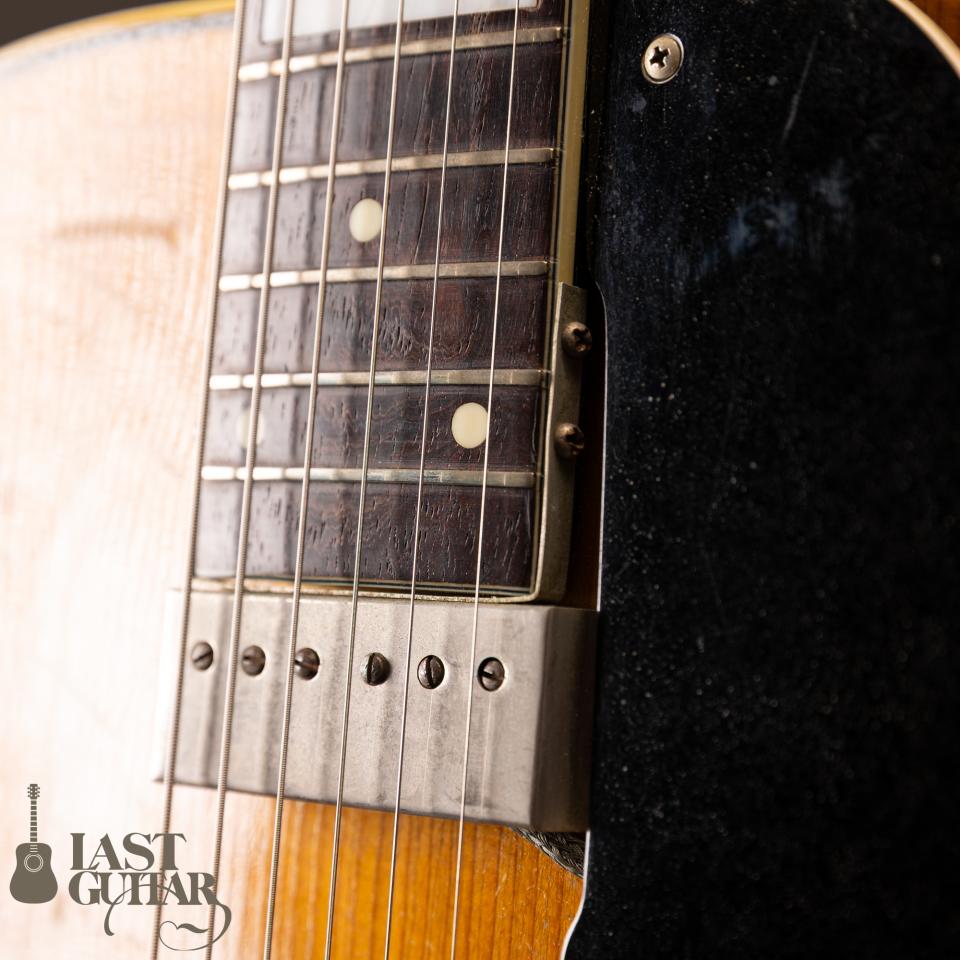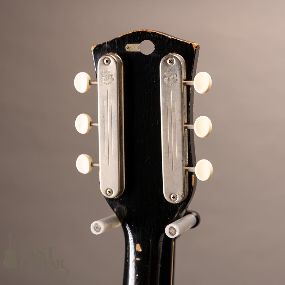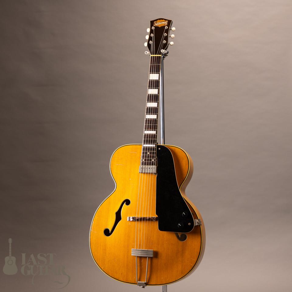 短期間製造されたレアな17インチワイドのナショナルフルアコモデルです。貫禄たっぷりながらヘッドシェイプ・ボディシェイプやネックヒールがフラットでネックを支えるようになっていたり、ネックヒールについたマイナスネジ、クローズドのオリジナルチューナーなどニコッとしてしまう愛らしい内容がたまりません。また経年により色づいたボディもすごく良い雰囲気です。