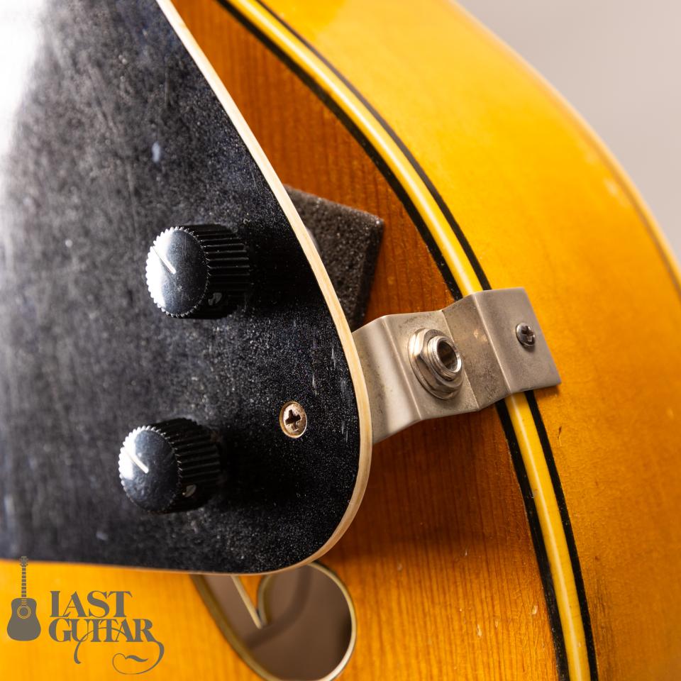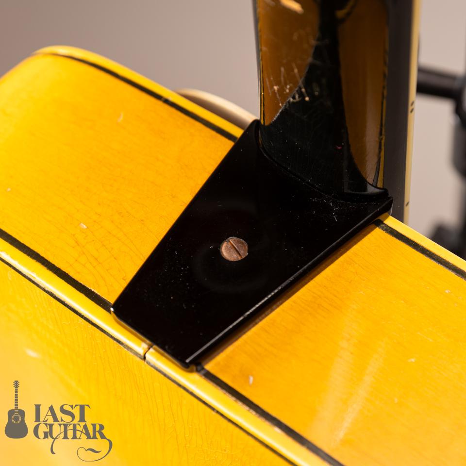ラミネートスプルーストップに、ラミネートメイプルバック&サイド、パラレルブレイシング、ボルトジョイントネックの仕様で、ピックアップは、フローティングのフロントマイク1発搭載です。コントロールは迫力あるブラックのラージピックガードにヴォリューム、トーンがマウントされていてレトロ感たっぷりです。ジャックは、ピックガードを止める金具部分に取り付けられています。ネックまわりにつきましては、約43mmナット幅に、厚みのあるしっかりとしたグリップでこれはこれですごく良いと思います。スケールは、ミディアで、重量は、2.975kgです。