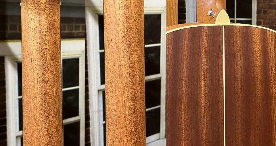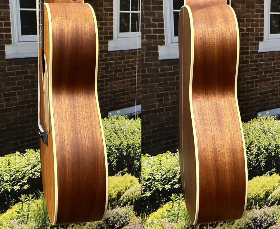 本器は表板にスプルース単板材、側板・裏板にはサペリ単板材を使用したオール単板仕様。