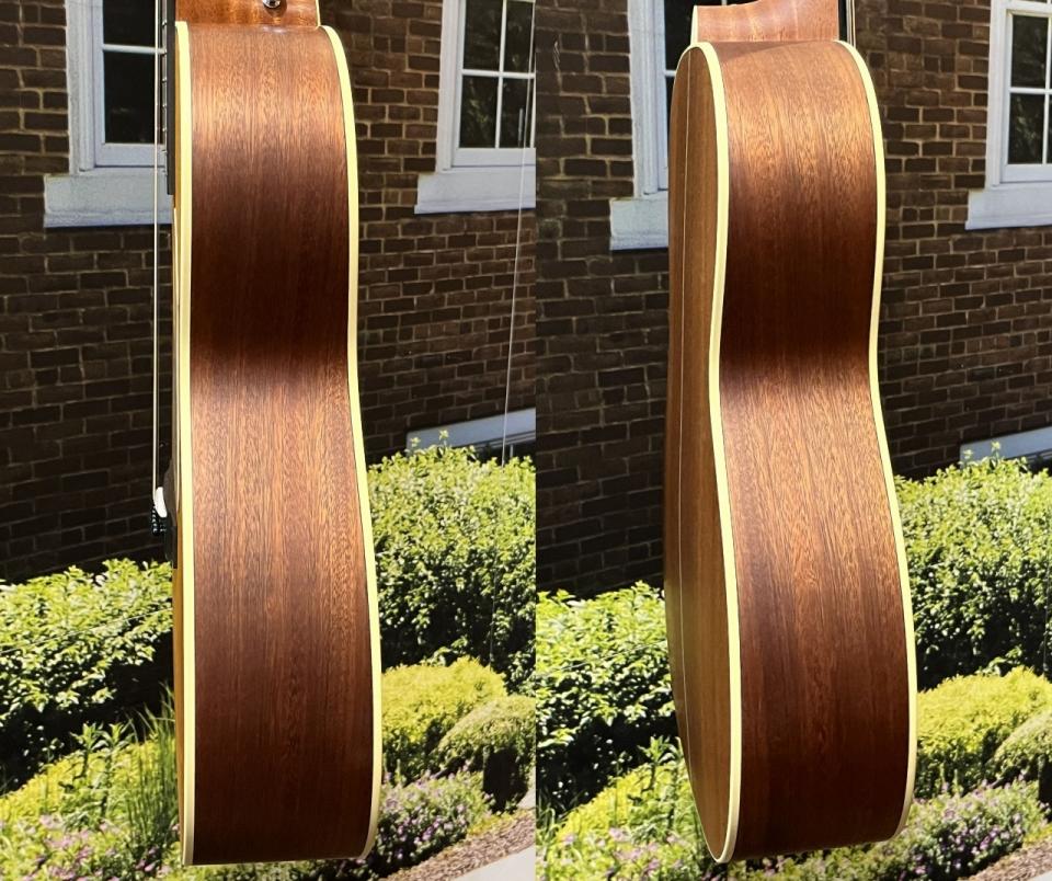 本器は表板にスプルース単板材、側板・裏板にはサペリ単板材を使用したオール単板仕様。