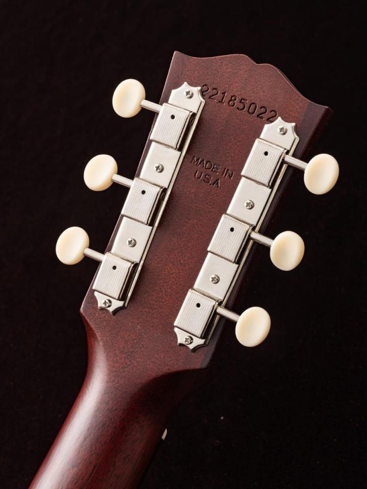 Grover?製のストラップ・チューナー(3連のホワイトボタン仕様)は安定したチューニングを実現し、ティアドロップ型ピックガードとともにヴィンテージモデルの魅力を高めています。