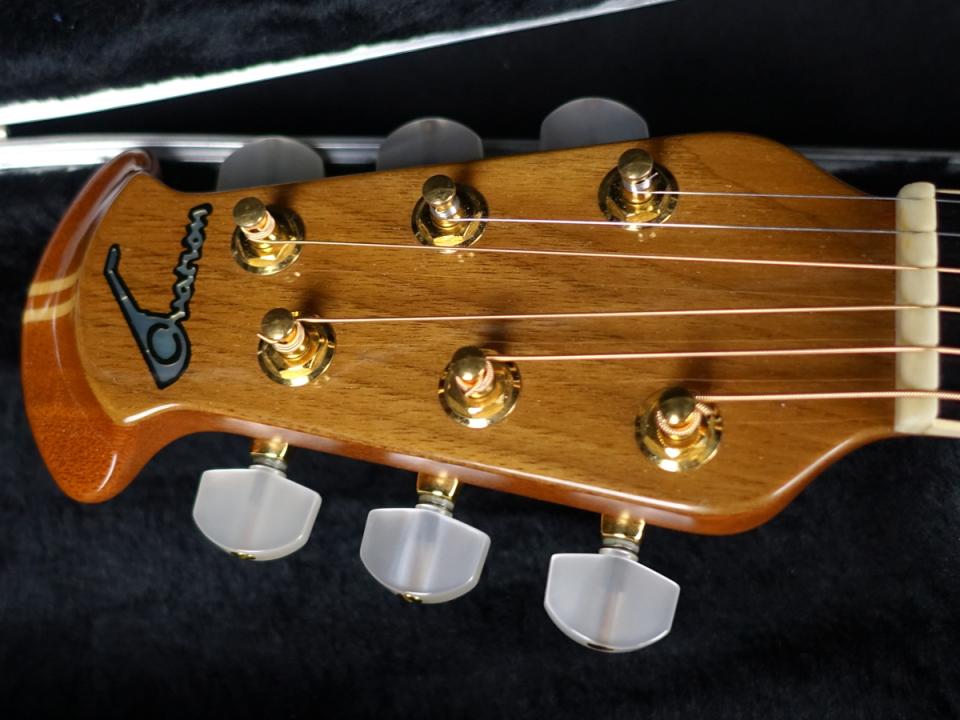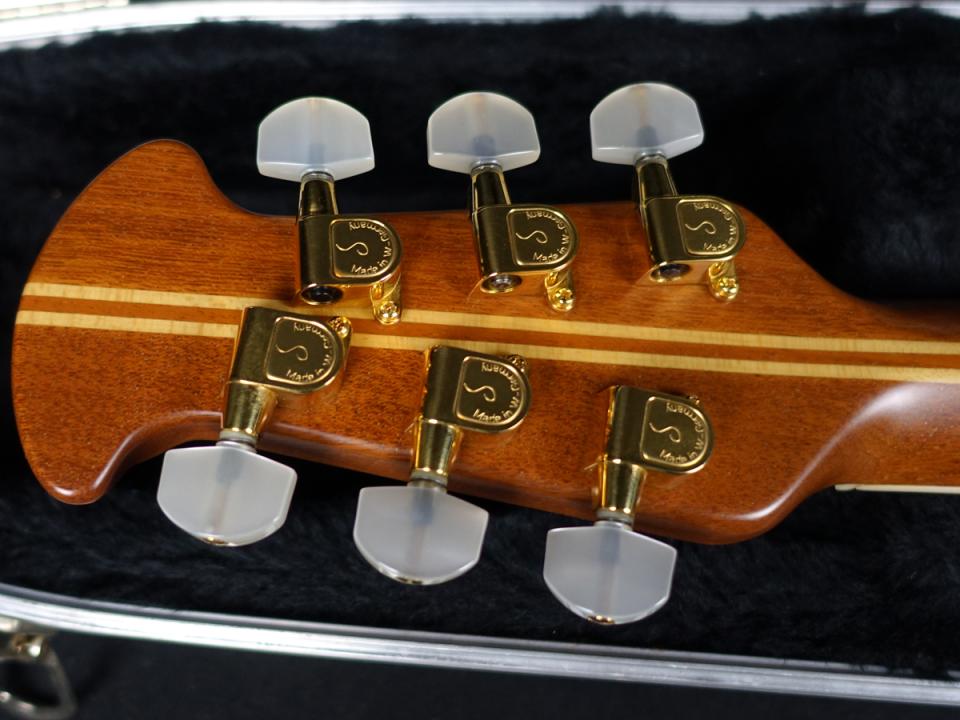 マホガニー/メイプルの5Pネックに、エボニー指板材、ブリッジには美しい彫刻をあしらったウォルナットを使用しており、ゴージャスなルックスにまとまっております。