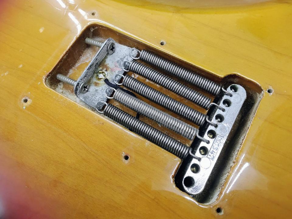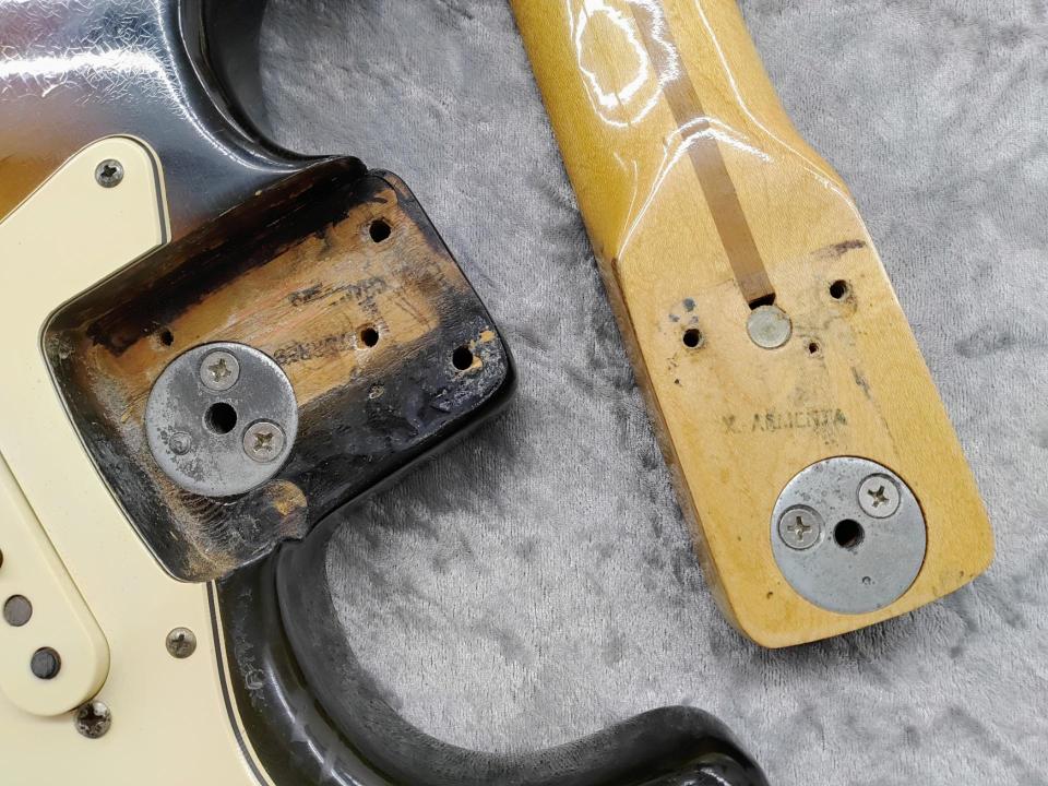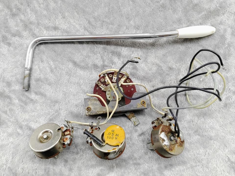 ボディトップの塗装剥げなど全体的に年代なりの風格があります。フレットはヴィンテージタイプに交換され減りは少なめで8割程度残。合わせてナット交換と指板の塗装が施されています。ネック状態良好、トラスロッドナットの動きはスムーズで充分な余裕があります。ピックアップはフロントとリアがオリジナル、センターは同様のスタガードポールピース・グレイボビンの同年代で少し後の物に交換されていると思われます。電装系は近年パーツに一新されており、5点スイッチに交換、ハイパスコンデンサーが取り付けられでいます。オリジナルのスイッチとポット(ボリュームはハンダで判別できませんがトーン×2は72年)とコンデンサーが付属します。ハードケースは取っ手が交換されています。