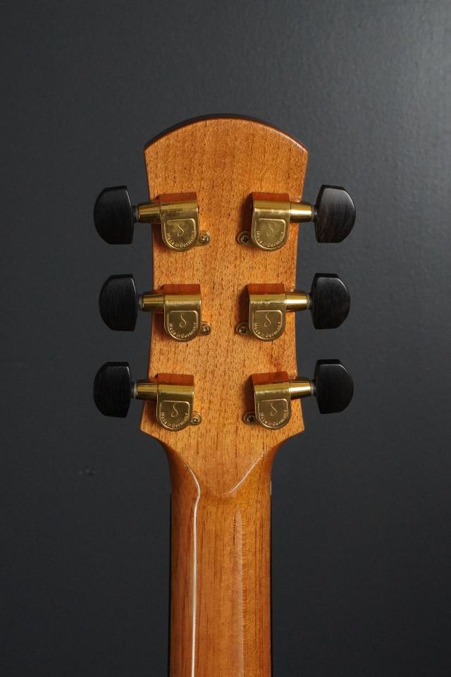 ヘッドトップにはエキゾティックなウッドのヘッドトップでロゴなどは無いシンプルなデザインですが、綺麗なラインを描くヘッド形状と、Schellerゴールドでエボニーつまみのペグと共に、これで必要十分と感じられる、シンプルに纏まったルックスです。
