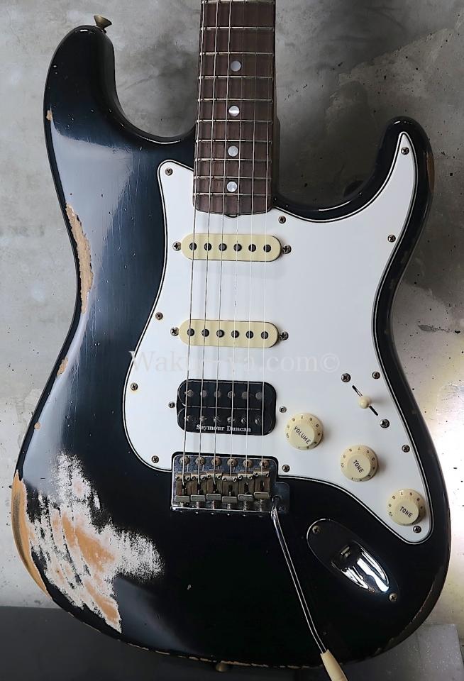 Blackフィニッシュと、ヴィンテージ風に程よく使い込まれたレリック漂う演奏性の高い激鳴りの1本。