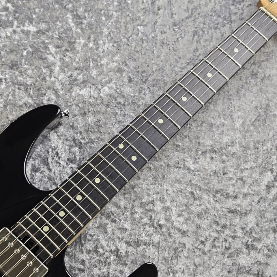 12~16インチコンパウンドラジアスのエボニー指板には、22本のジャンボフレットとクリームドットインレイを採用。