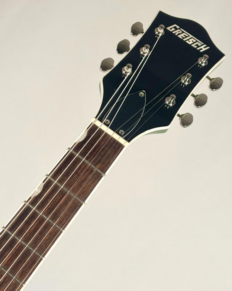 小さめの50年代後期G6120バウンドヘッドストック、ヴィンテージスタイルのオープンバックチューニングマシンがルックスの良さをさらに引き出しています。