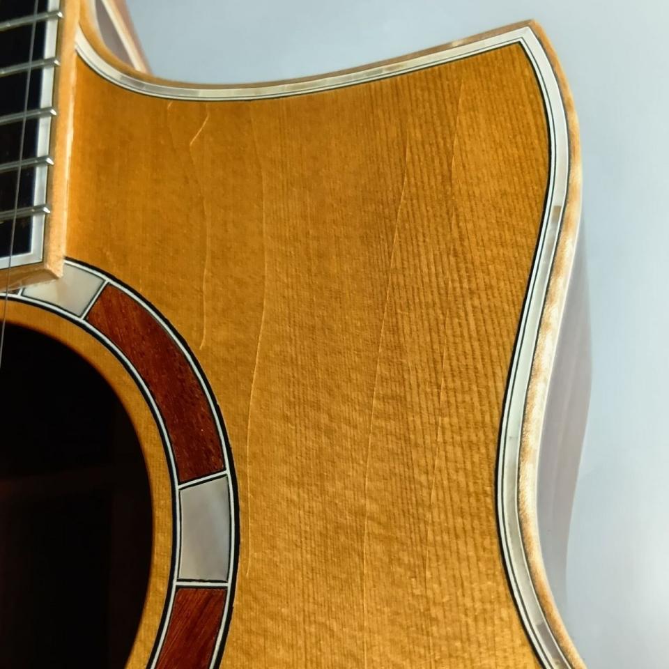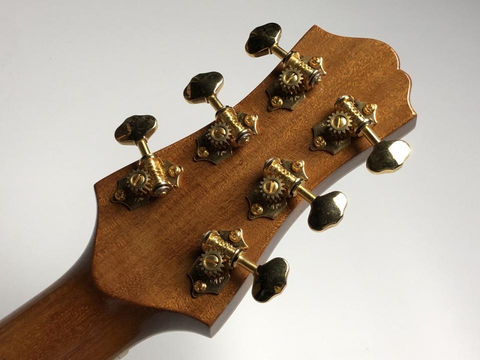 ラッカー塗装は、吹き付けと研磨を何度も繰り返すことで薄く透明度が高く、木の持つ魅力を最大限に引き出すことができます。また、自然に力が入り楽に弾けることを目指して、ネックには太さを残し、背の高いフレットを採用しております。この塗装やロッド等へのこだわりで、長時間でも疲れにくい軽さと、ためらいのない素直な音抜けを実現しています!