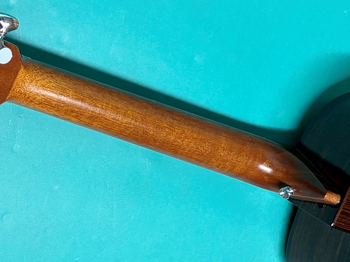 当店入荷後、各部を調整済み。12フレット上での弦高は6弦:2.6mm、1弦:1.8mm、スケールがトラベルサイズのショートスケールのため、弾きづらさは感じられません。