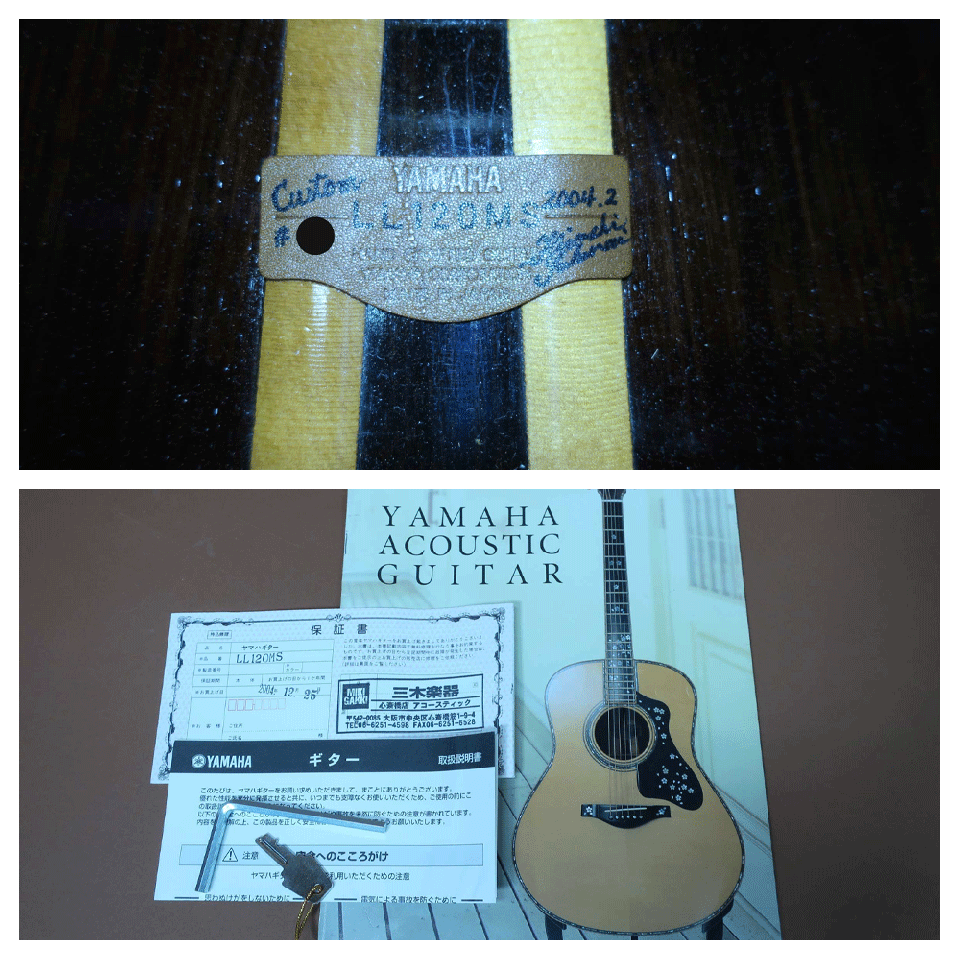 2002年版 YAMAHA カタログの表紙を飾った希少モデル、YAMAHA LL-120MS Customの入荷です!ご存知の方も多い『さだまさし ベスト-2』のCDジャケットにも使用されている記念モデル。本器はさだまさし氏デビュー30周年を記念して制作されたアニバーサリー・モデルで、シリアル NOは10番代の初期モデルです。2002年版 YAMAHA カタログの表紙を飾った記念モデルで、ヘッドに豪華なアバロン・トリム、『 SADA 』 ネーム・アバロン・インレイ、オリジナル・TM-66Gゴールドペグ、エボニー指板&ブリッジ、メイプル・バインディング、オリジナル・ピックガード、指板からピックガード、下駒へと舞い落ちる桜の花びらをデザインしたアバロン装飾は上品で美しくしいルックスは、アニバーサリー・モデルに相応しい芸術性にも優れた逸品です。トップには杢目の整った最高級のインゲルマン・スプルース単板に、サイドには杢目の美しい柾目ハカランダ、バックには板目のワイルドな最高級ハカランダ単板とセンターにエボニー材を使用し70年代L-53と同仕様の3ピース仕様が採用されております。ネックはホンジュラスマホガニー&黒檀5ピースで、'70年代のL-53を思わせる積層ネックの仕様です。またボディーはグロスのラッカー塗装、ボディー内部はセラック塗装が施され、インナー革ラベルには桜井氏のサインが確認できます。厳選した最高級材を使用し熟練のクラフツマンの技術を惜しみなく投入された逸品です!、個性的なヘッド・スタイルと装飾もバランスよく豪華に施され2002年のカタログの表紙を飾った、さだまさし氏デビュー30周年を記念して制作されたアニバーサリー・モデルです!。ご希望が有りましたら表紙を飾った当時のカタログもお付けします。サウンドは言言ううまでもなく、さださん監修の艶の有る繊細さと力強さを兼ね備えた素晴らしい鳴りです!お探しだった方はこの機会に是非コンプリートして下さいませ。