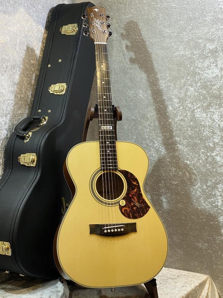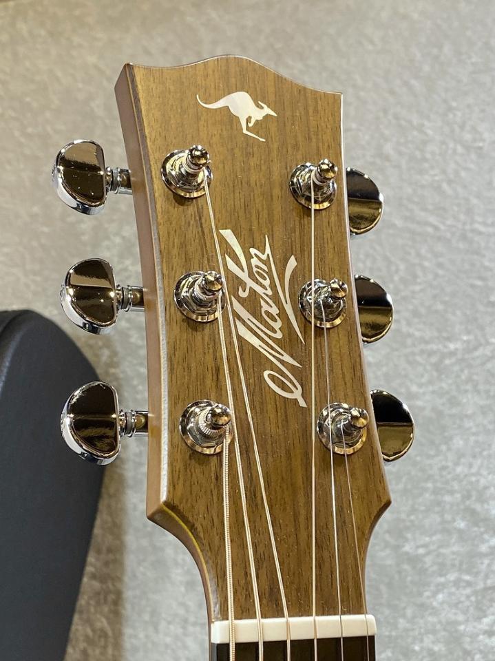 トップは、霜降りシトカスプルース単板、サイドバックはうっすらフレイムがかったクイーンズランドメイプル単板が使われております。真っ黒なエボニー指板・ブリッジ、ヘリンボーンロゼッタ、特徴的な形のピックガード。そしてシグネイチャーモデルの証である、ヘッドのカンガルーインレイ、12fのC.G.Pブロックインレイ。