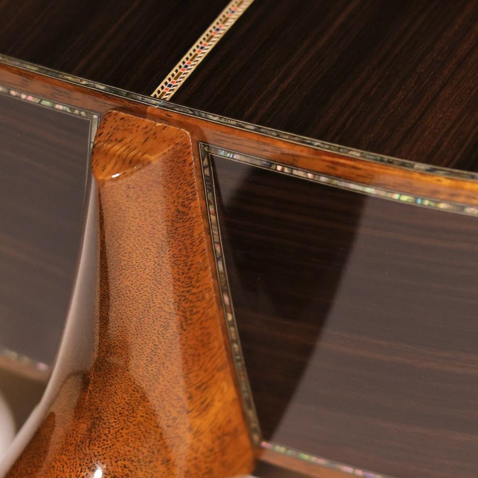 さらに、濃い色味のハイリー・コア・ウッドバインディングとセレクトアヴァロンの装飾が絶妙な組み合わせ。やや赤みを帯びたアヴァロンの輝きが全体のカラーと調和し、落ち着いた暖色系の高級感あるルックスに仕上がっています。