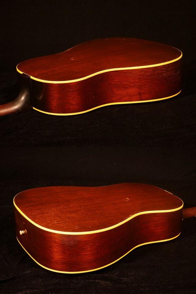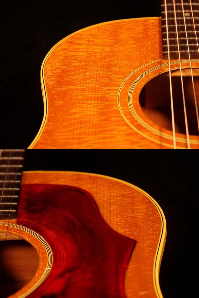 ラウンドショルダーボディにトップ・スプルース、バック&サイド・マホガニー、ネックはマホガニー、指板/ハカランダ、ADJハカランダブリッジ、TASQサドル、ツーリングロゼッタ、クルーソンペグ、厚手ラージピックガード、ノンスキャロップドXブレーシング。