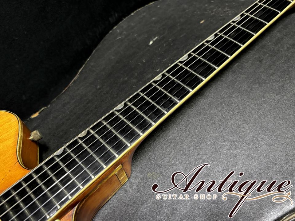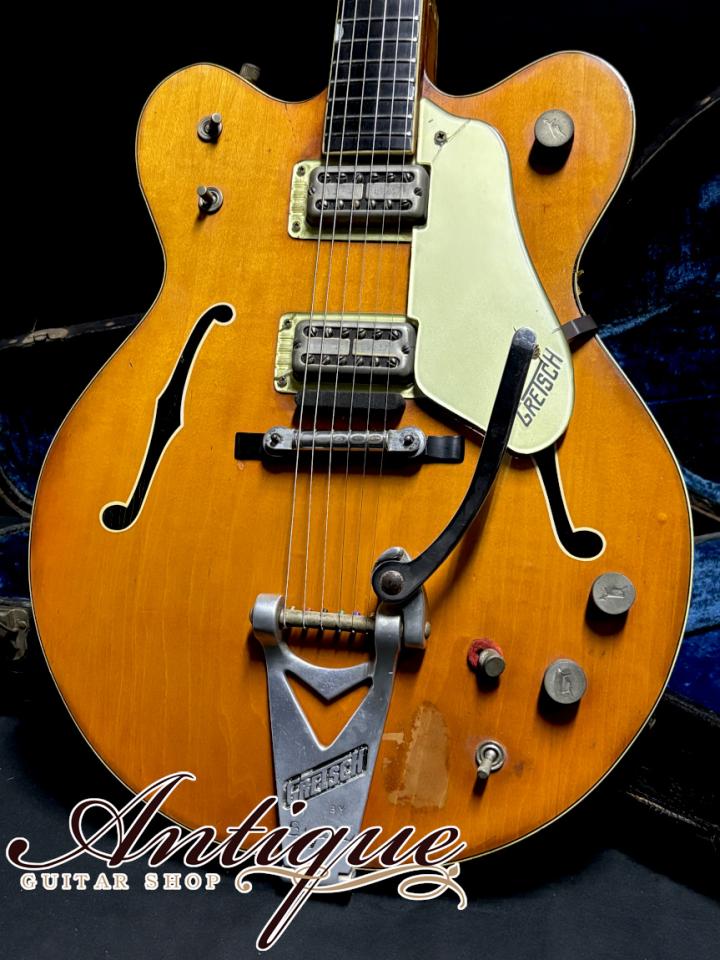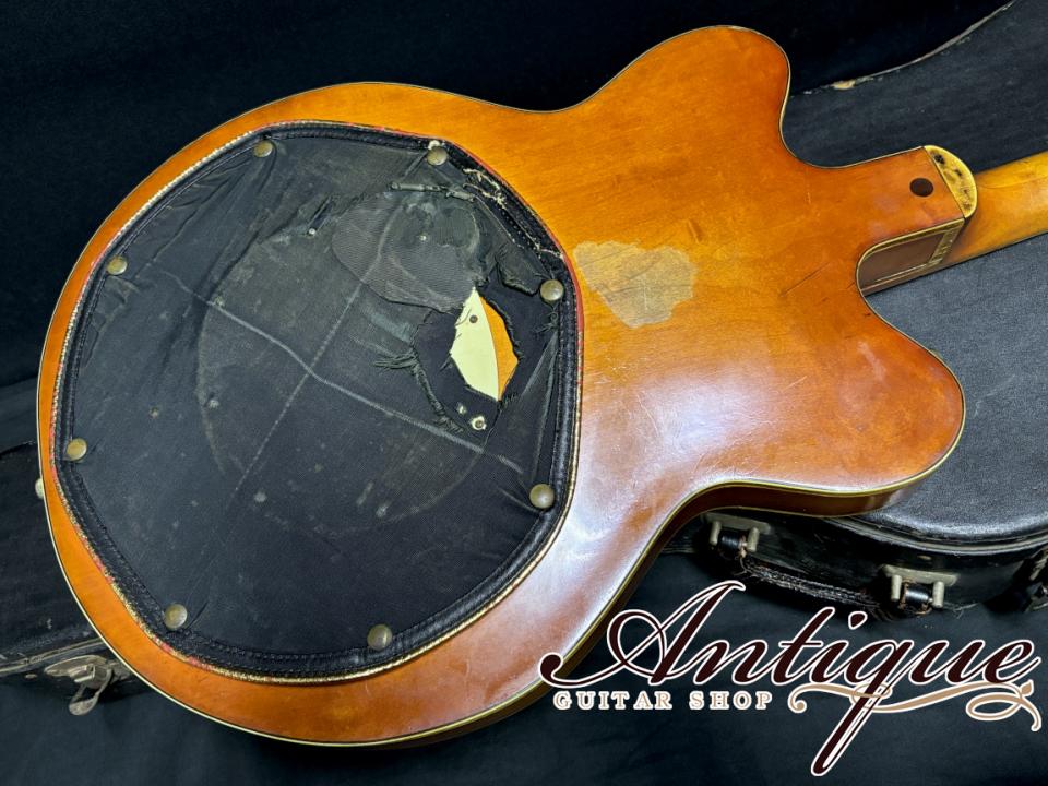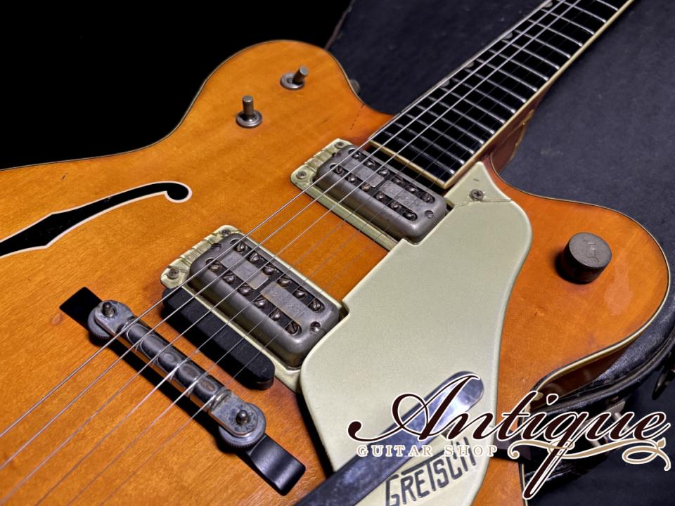 最後に状態としては、サウンドの良い個体という事を裏付けるかのような、年式相応の使用感、経年変化が見受けられます。各所に使用による塗装剥がれや、この時期のGretschでは当たり前となるバインディングの経年劣化、背面パッドは後期のビニールではなく前期の布タイプにて一部に破れや補修跡が見受けられます。その他金属パーツの経年劣化も見受けられますが、年式相応なコンディションにて、逆にリイシューモデルには出せないオリジナルヴィンテージならではの風格を感じさせてくれます。パーツ類に関しては極めてオリジナル度が高く、ブリッジがローラーからバータイプに、ピックガードの交換の可能性(シグネイチャーロゴ無し)、ビス類がいくつか交換されている以外は、フレット&ナット、ポット等の消耗品を含め、全て当時からのオリジナル。電装関係のハンダもバージン、ありがちな木部修復歴等もございません。演奏面としてはオリジナルフレットの高さは5部山程度と低くなりながらも、まだまだご使用頂ける状態にて、ミュートはスポンジ部のシュリンクがありながら、まだ機能しております。ネックコンディションは良好で、トラスロッドは経年により固くなっていながらも、まだまだ余裕が残っております。ケースはおそらく1970年代頃と思われる汎用のヴィンテージケースが付属致します。