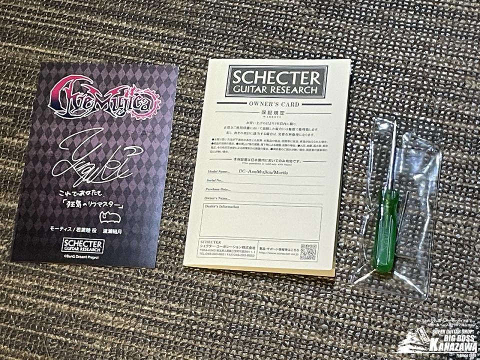 SCHECTERソフトケース、ポスター、メッセージカードが付属します。