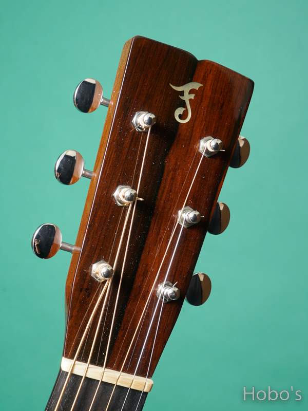 本ギターはフランクリンギターの代名詞的モデルOMを基本に製作された名器で、極めて流通の稀な逸品です。表板には木目の詰まった最高級アディロンダックスプルース、側裏板にはハカランダに音響特性が近い希少材マダガスカルローズウッドを贅沢に使用し、ニカワ接着やラッカー塗装を用いて製作されていることが特徴と言えるでしょう。各部に配された最高級材と、巧みな作り込みから生まれる厚みのあるサウンドは、ロングサスティーンが効いた広がりのある出音。柔らかくきらめく音色は、どのメーカーや作り手とも異なるリッチなサウンドで、他にはないその魅力的なトーンはまさに格別。ニック氏の初期に手がけた作品とも異なり、マーティンギターとは一線を画すウッド感溢れる出音に仕上がっております。カントリーブルースやラグタイムをはじめ、フィンガーピッカーにはもちろんのこと、演奏スタイルや音楽ジャンルを選ばず様々にご使用頂けるまさに傑出した現代の名器。一生物のルシアーメイドギターや伝統的手工モデルをお探しの方には特におすすめで、名工が贈る最高級サウンドの魅力を存分にご堪能して頂けることでしょう。