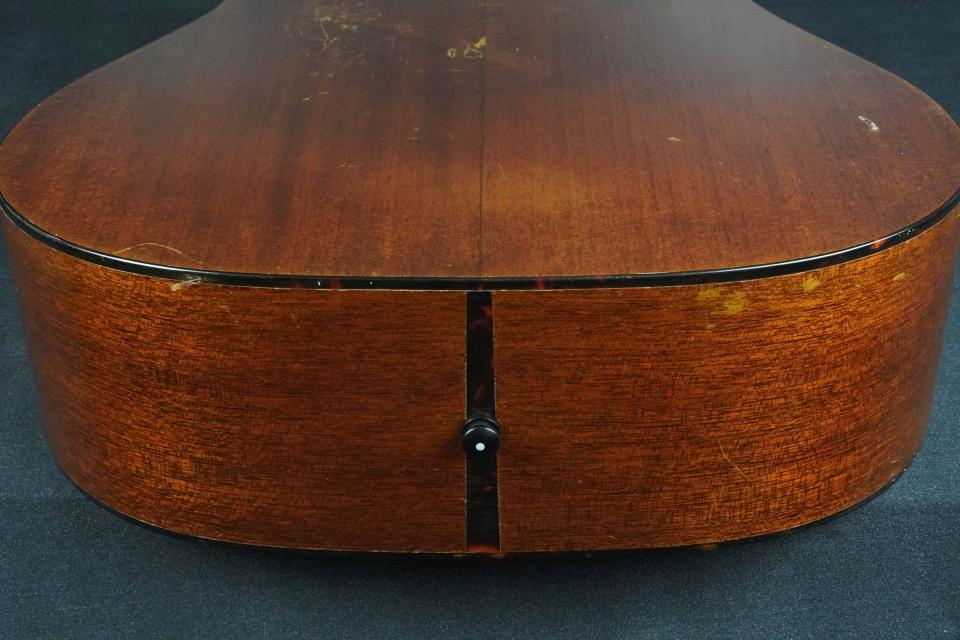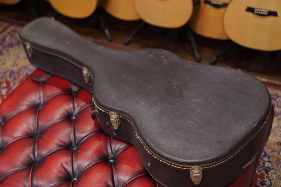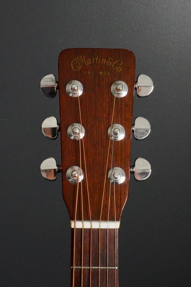 60年代らしい丸みを帯びたヘッド形状、赤黒いブラジリアンのヘッドプレートに色焼けたMARTINのゴールドロゴ、ペグもパテント刻印の入ったオリジナルのグローバーチューナーで、いかにも60年代らしいスタイルです。