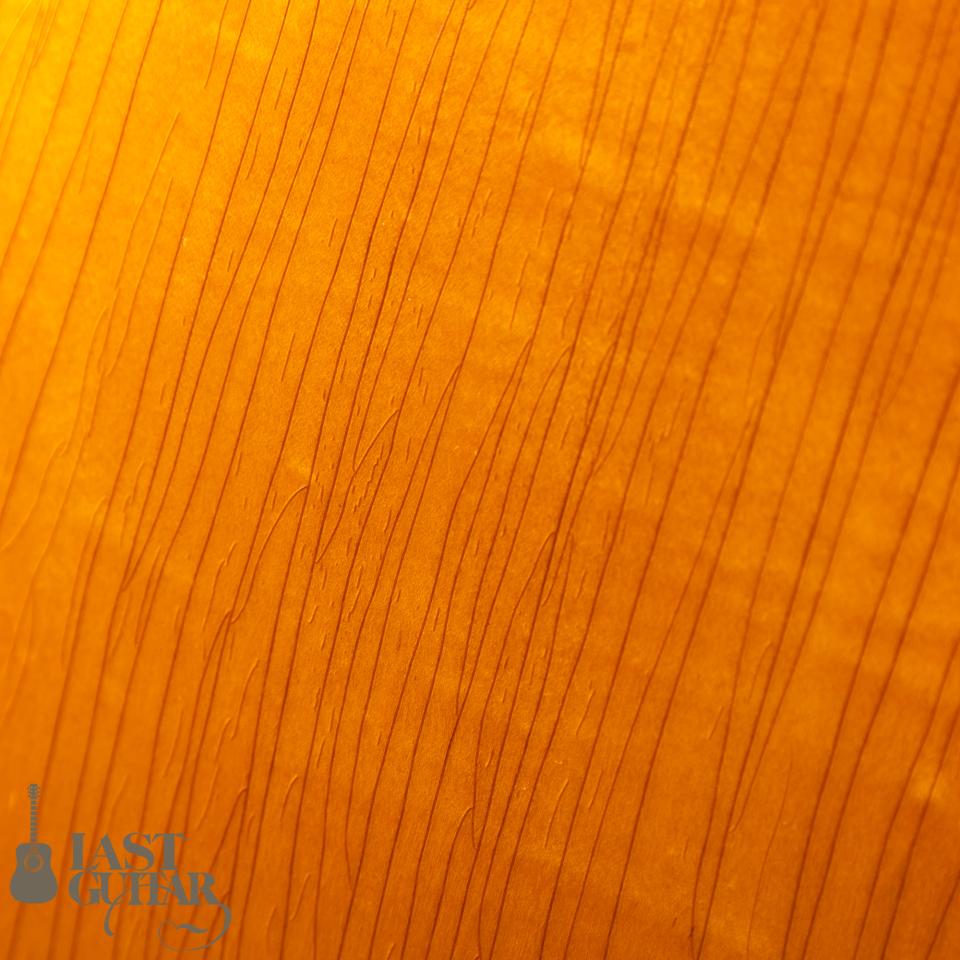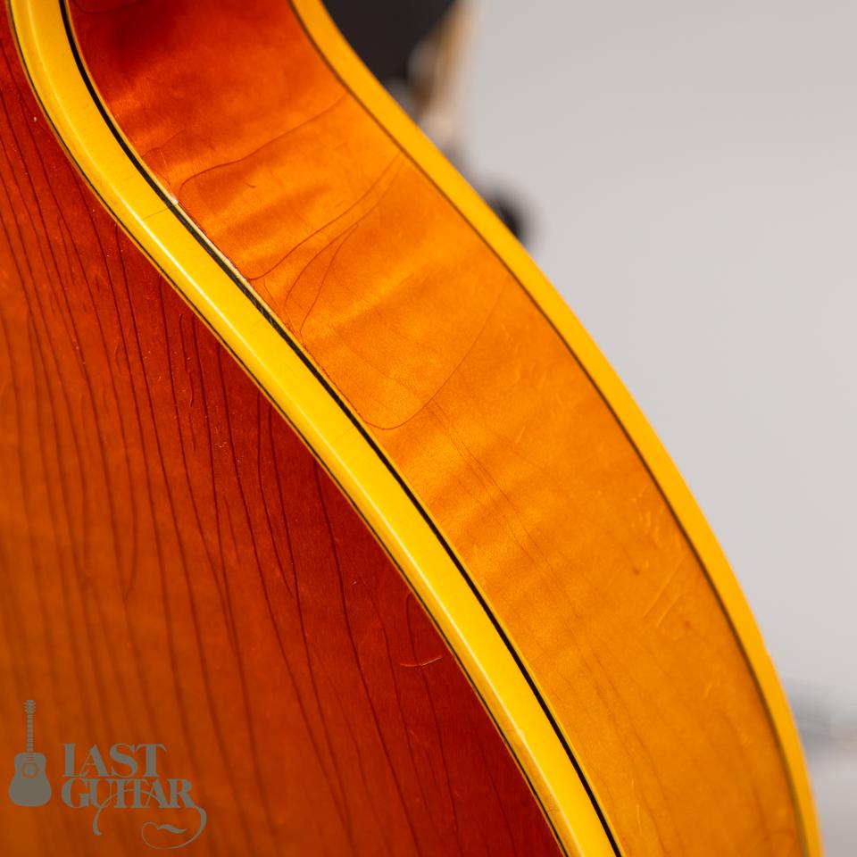 23-1/2インチ(約596.9ミリ)のショートスケールに17インチのボディサイズ、シンボディ(2-1/4インチdepth)で絶妙なフィット感を持ち、弦テンションがソフトでより実用性が高いモデルです。トップは、美しい木目が整ったスプルースで、サイド&バックは、上品に杢が入ったメイプルが使用されております。ネックもウォルナットを間に挟んだフィギュアドフレイムが美しいメイプルの5ピース・ラミネイトネックです。フィンガーボードは、今では大変貴重な漆黒のエボニーが使用されております。ナット幅は43ミリを少し切るくらいで、ネックグリップはラウンドグリップで馴染みやすいと思います。重量は、約3.05kgと程よいウェイトです。ピックアップは、ステッカードナンバードを2基搭載しており、あたたかくメロウで味のあるサウンドをアウトプットしてくれます。上位機種らしいボディトップとバック、ヘッドトップに施されたマルチバインディング、フィンガーボードバインディング、美しいブロックのフィンガーボードインレイ、ヘッドのフラワーポットインレイ、BYRDLAND文字入りテールピース、ゴールドチューナー、バウンドFホールなど豪華なルックスもとても良いです。