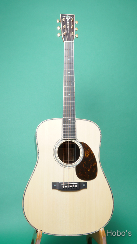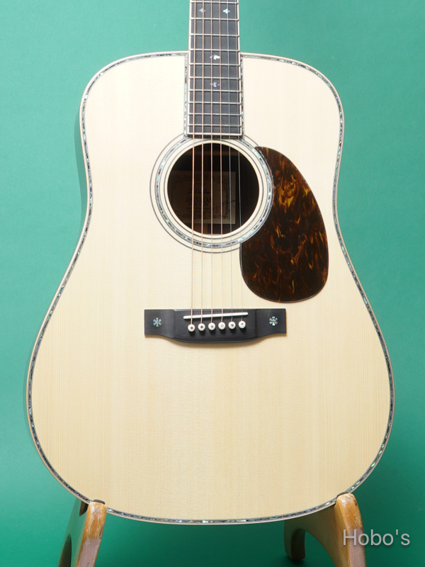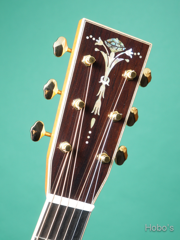本ギターはフラッグシップモデル「エンペラー」の直系機種で、ラインナップ中最も高い人気を誇る年間限定生産です。表板には貴重なジャーマンスプルース、側裏板には極上のインディアンローズウッドと、それぞれ厳選された単板材が採用されております。作り込みの良さからなるはじけるような低音域と、艶やかな高音がバランス良く響き渡り、豊潤にして倍音のある綺麗な出音は秀逸。きらびやかな美しいサウンドに仕上がっております。また、スタイル42の華麗なインレイワークと、メイプルによるウッドバインディングからなる上品な外観美も一入。貴重なハカランダのヘッドプレートに燦然と輝くトーチインレイも相俟って、巧みな作り込みからなる国産ハンドクラフトギターの魅力を存分にご堪能して頂けることでしょう。