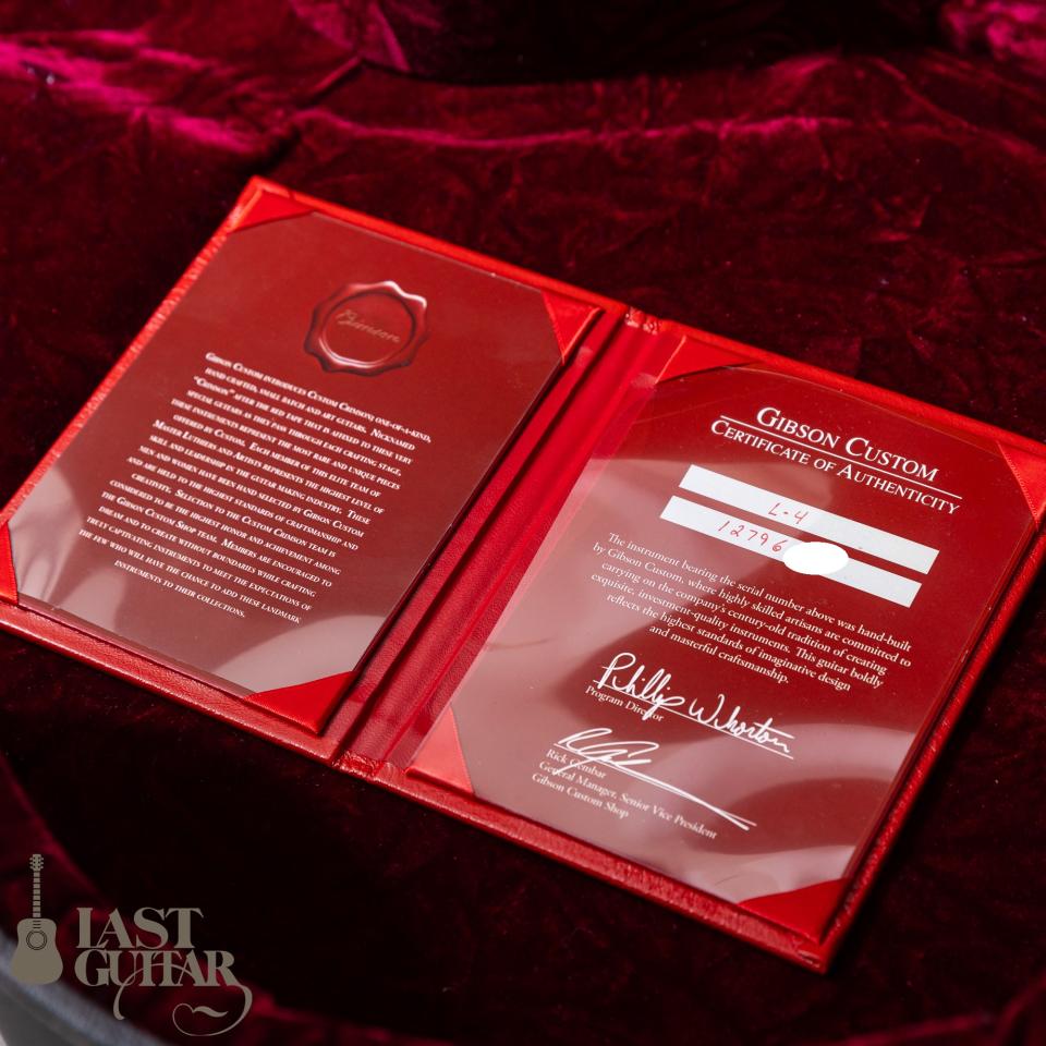 掲載の真紅の“Custom Crimson”(カスタム・クリムゾン)認定書付き。ケースは掲載のギブソンのハードケースが付属いたします。