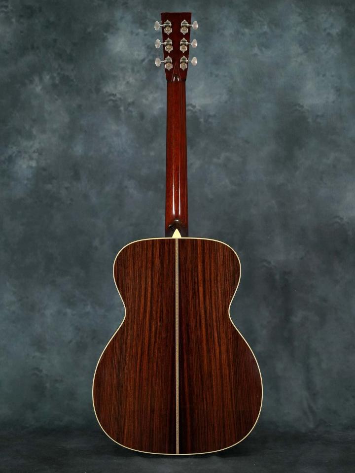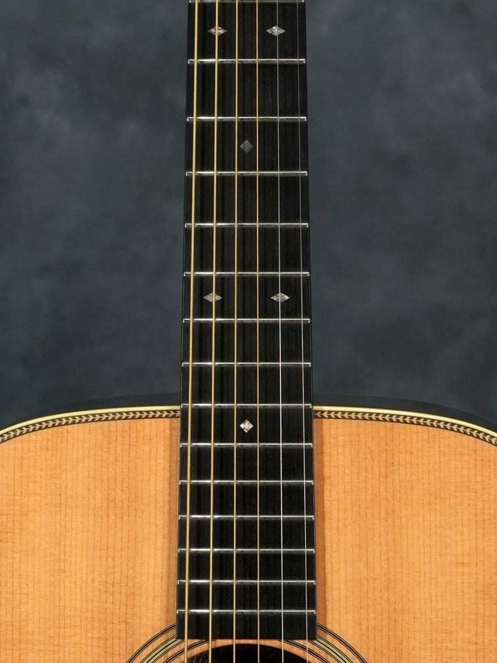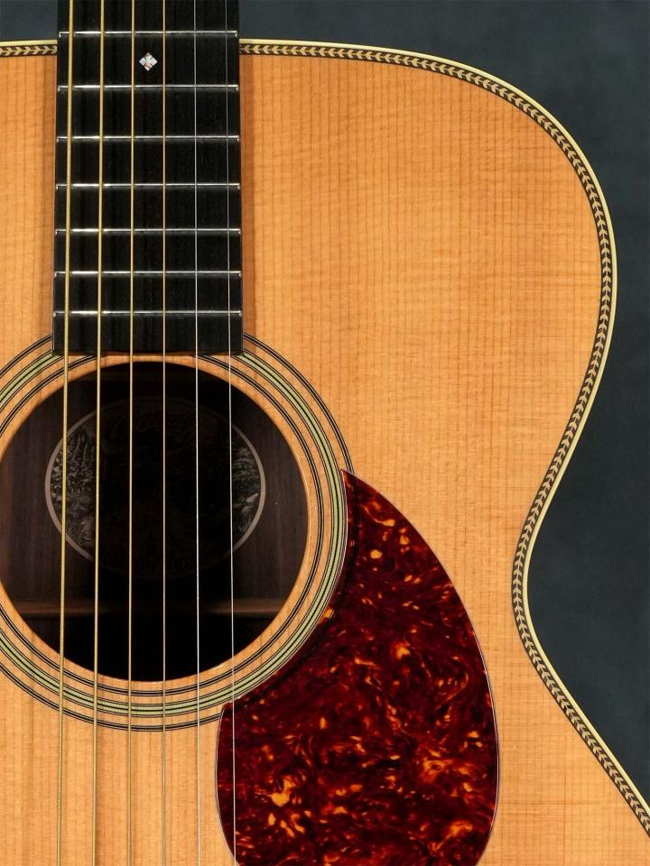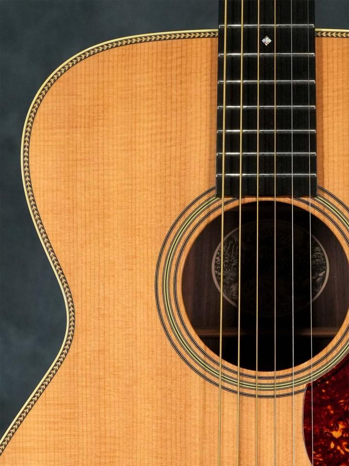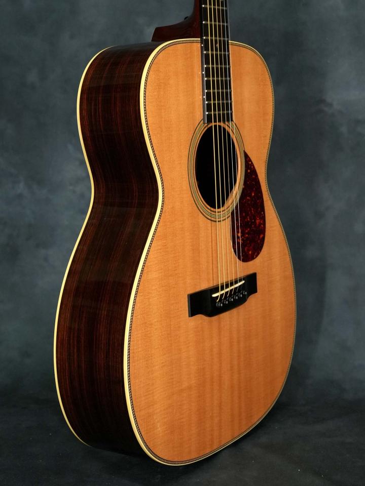スプルースTop&ローズウッドSide/Backのボディに、スキャロップブレレーシング、ナット幅43.5mm(実測値)で緩やかなVシェイプのマホガニーネック、約648mmのスケール、ダイアモンド&スクエアインレイの入ったエボニー指板、エボニーブリッジ、回し心地の良いWaverlyチューナー。ベッコウ柄のピックガードやヘリンボーントリムなど戦前のMartin OM-28を意識したデザイン。