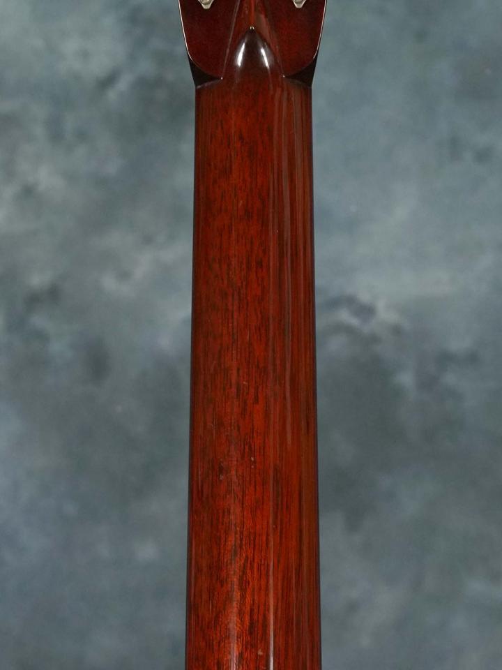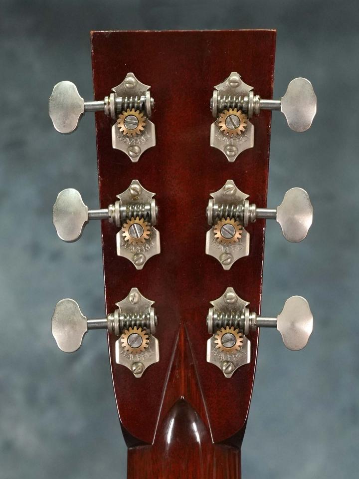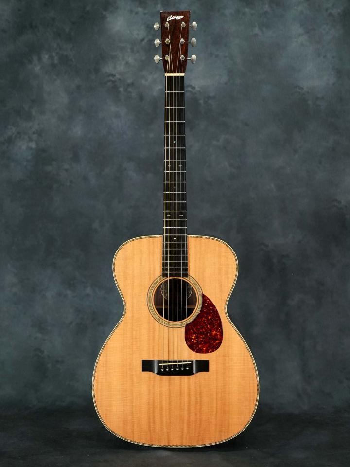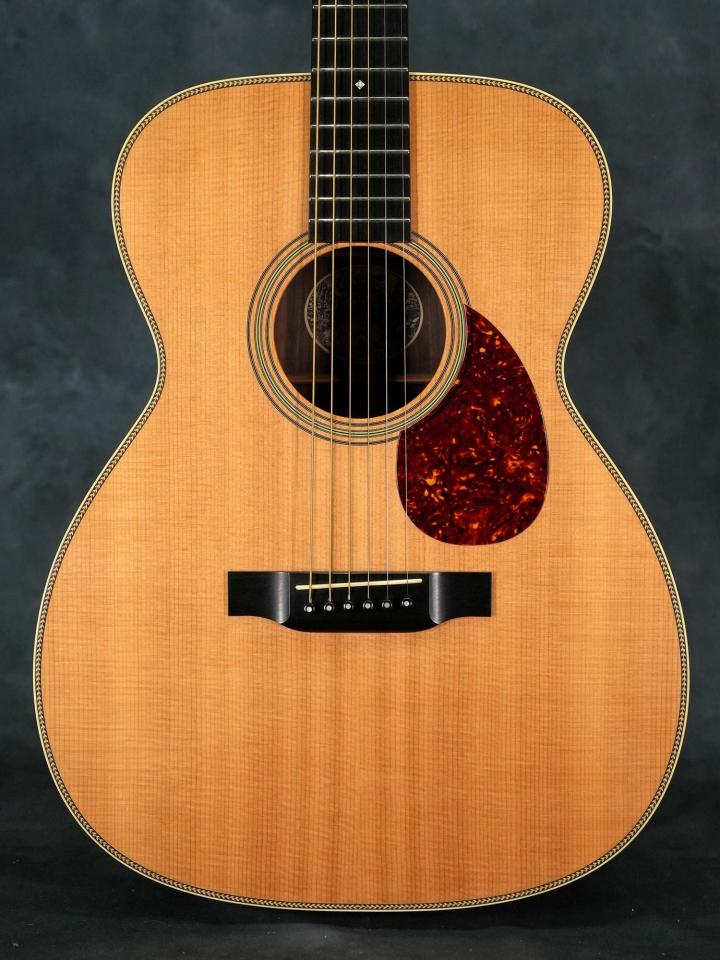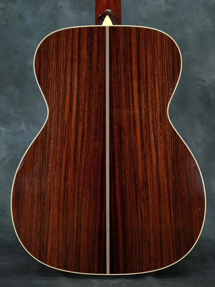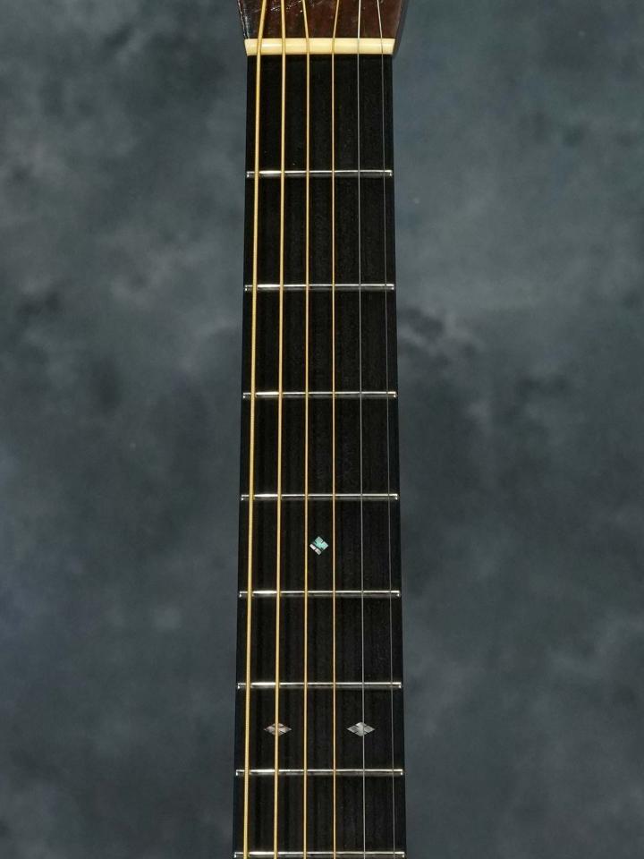 スプルースTop&ローズウッドSide/Backのボディに、スキャロップブレレーシング、ナット幅43.5mm(実測値)で緩やかなVシェイプのマホガニーネック、約648mmのスケール、ダイアモンド&スクエアインレイの入ったエボニー指板、エボニーブリッジ、回し心地の良いWaverlyチューナー。ベッコウ柄のピックガードやヘリンボーントリムなど戦前のMartin OM-28を意識したデザイン。