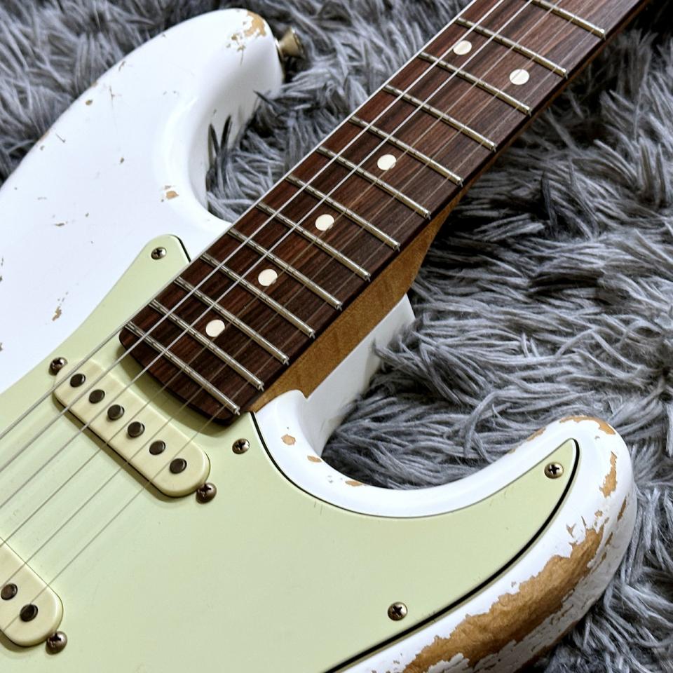 大人気かつ入荷が少ないXotic California Classic!定番のオリンピックホワイト/ローズ指板の60sスタイル。ピックアップは使い勝手の良いSSH仕様。圧巻のヘヴィ・エイジドは数々のギグをこなしてきた歴戦の1本のような雰囲気。また、極薄ニトロセルロースラッカーと相まって素晴らしいボディ鳴り。各木材のグレードも極上で文句の付けようがない1本に仕上がっています。